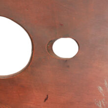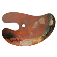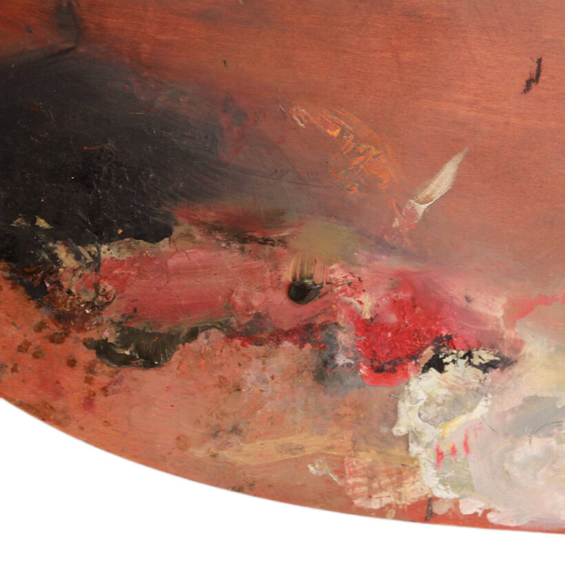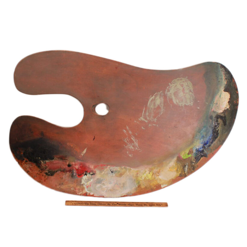 Antique oil painter’s artist palette in an exceptional form and large size — nearly two and a half feet long — c. early 20th century. Beautiful, sinuous shape and clearly crafted by a gifted woodworker. Given its impressive breadth, one can imagine its original owner was a well known artist. The palette is still dappled with paint, which makes it into a happenstance abstract painting itself. Ready to hang on the wall or return back once more to the hand of an artist.