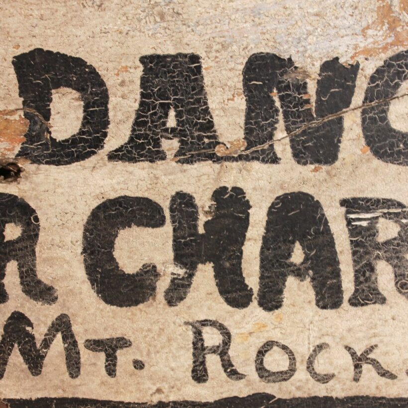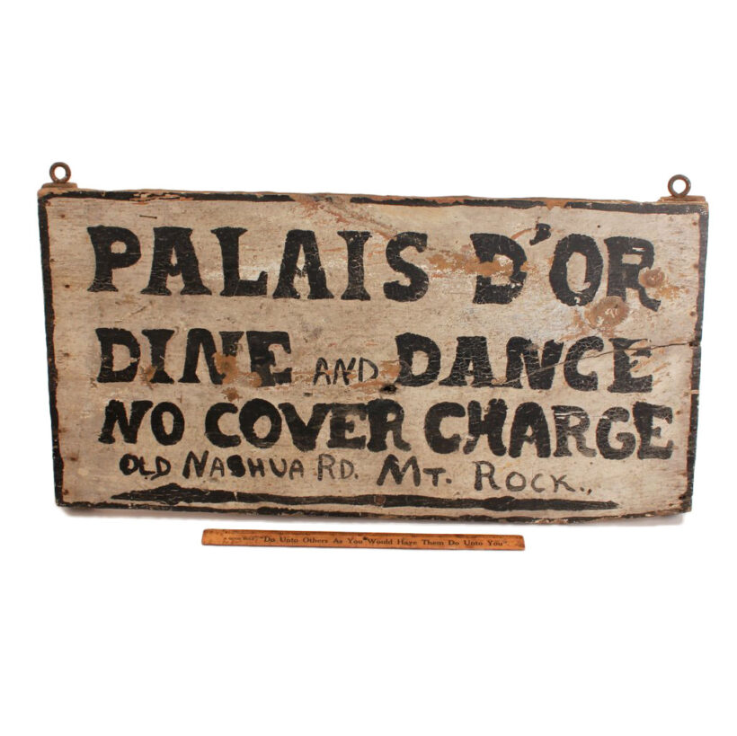 Hand-painted wooden advertising for the “Palais d’Or” — apparently a rural New Hampshire nightclub — c. 1920s. Appearing to date to the Prohibition era, it seems likely that this backwoods Palais of Gold likely offered more than dinner and dancing. Perhaps it was the smuggled Candadian whiskey that lured customers down Old Nashua Road to Mt. Rock? The sign is by the brush of an amateur painter, which only enhances the classy mystique of that now long-shuttered Palace of Gold.