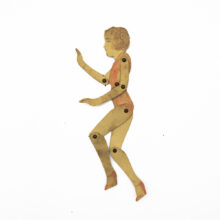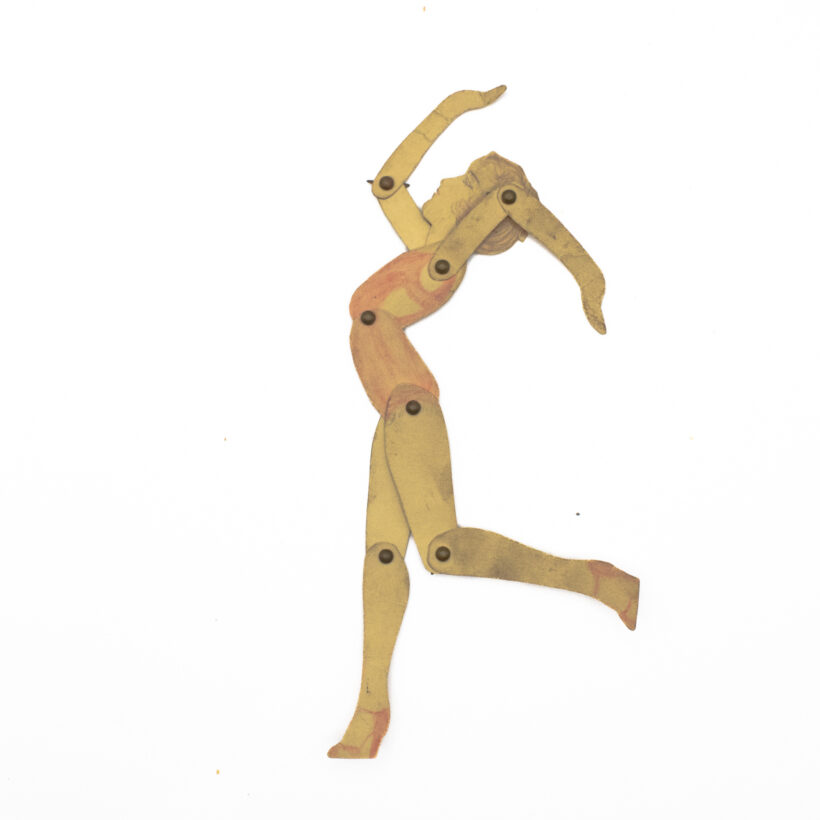 Handmade paper jointed woman striking a pose with brass jointed limbs and drawn features.