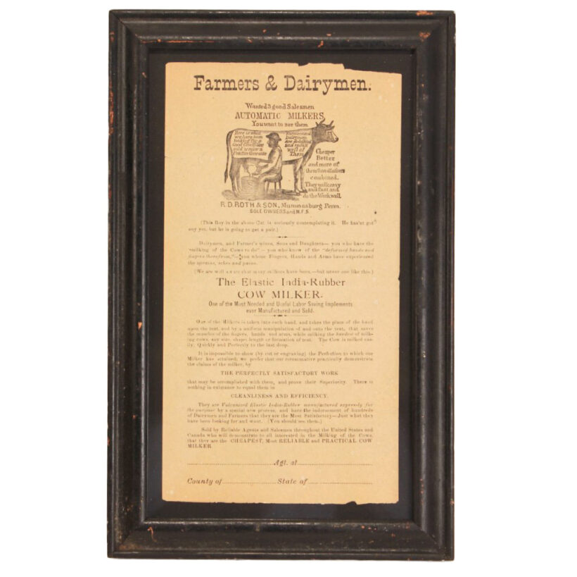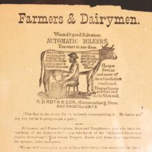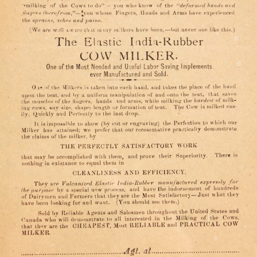 “The Elastic India-Rubber Cow Milker” was advertised as “One of the Most Needed and Useful Labor Saving Implements ever Manufactured and Sold.” Though manufacturers Roth & Son of Mummasburg, Pennsylvania dubbed it an “Automatic Milker,” it was in fact a hand-operated device. The manual milker distanced the hand of the farm worker from the cow’s teat by several inches but essentially required the same action as milking the cow directly.