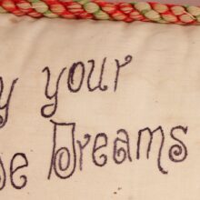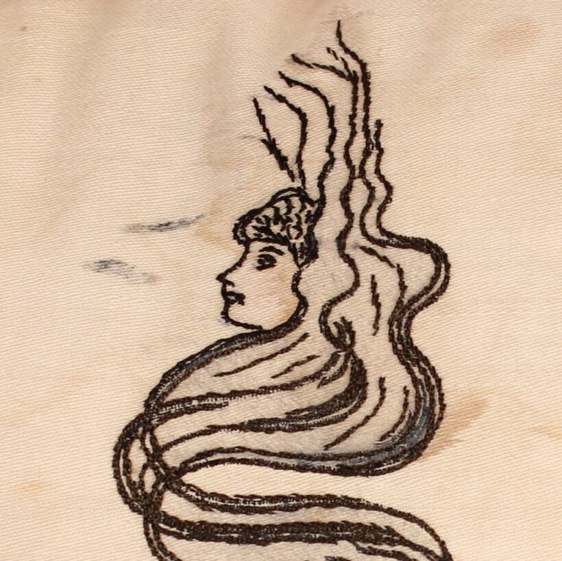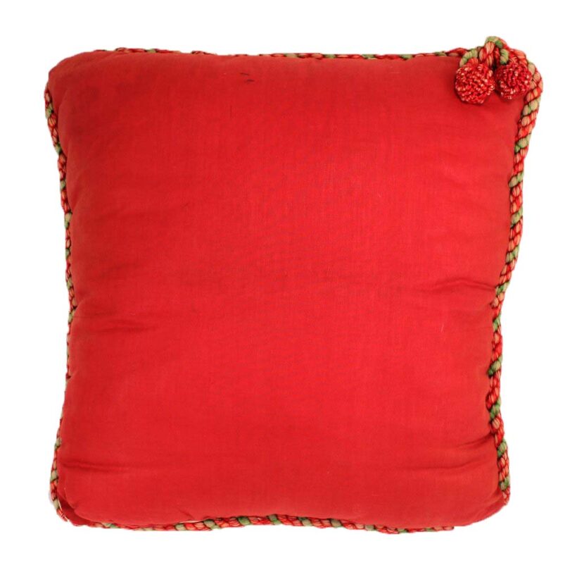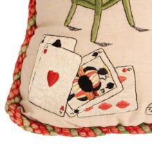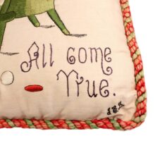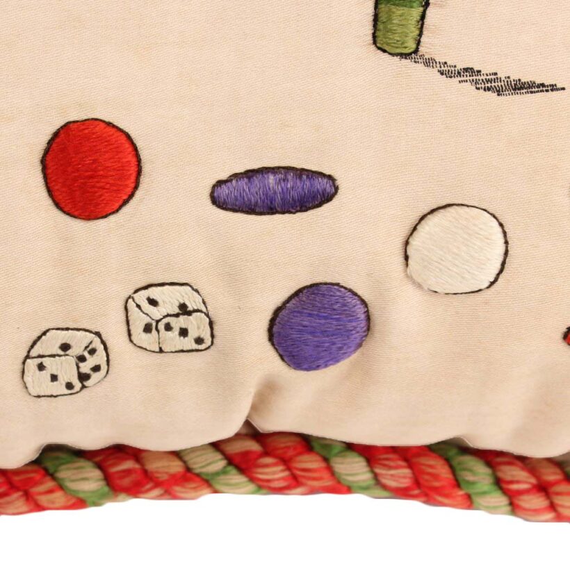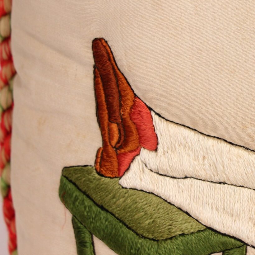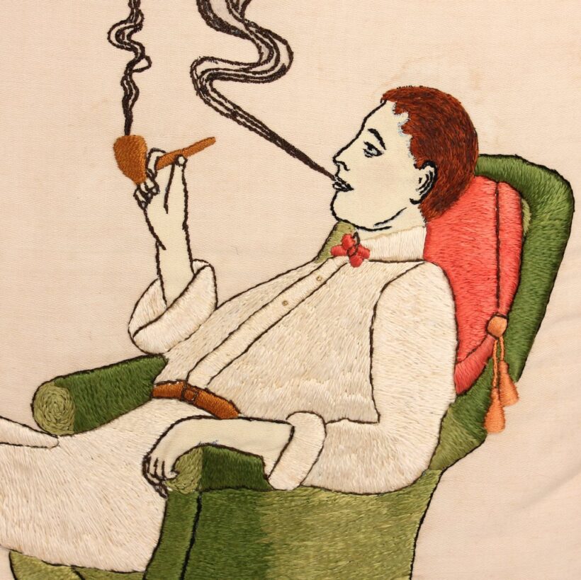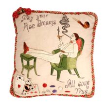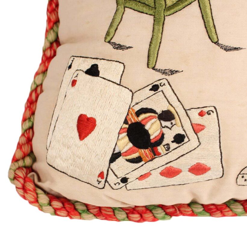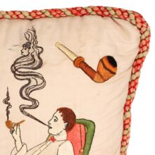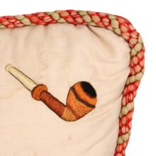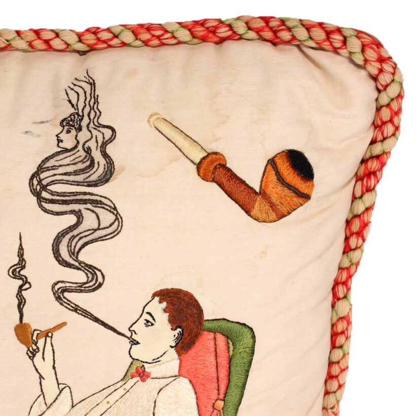 Embroidered and painted pillow for a bachelor with the slogan “May All Your Pipe Dreams Come True,” c. 1900. Elaborate silk embroidery in vibrant colors, depicting playing cards, a pipe, dice and poker chips, and of course the seated gentleman smoking. A fantasy lady emerges from the bachelor’s pipe smoke, who is certainly on his mind as he puffs away. She perhaps depicts the creator of this pillow, who wishes herself into the indolent bachelor’s romantic pipe dreams—maybe the pillow represents her own pipe dream? The pillow itself is beautifully made, with a heavy silk cord skirting the edge tying off in a tassel with intricate monkey knots. The piece is in a remarkable state of preservation, with only minor wear. Perfect for the pipe smoker or unrepentent bachelor in your life.