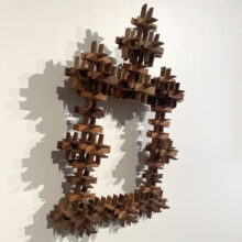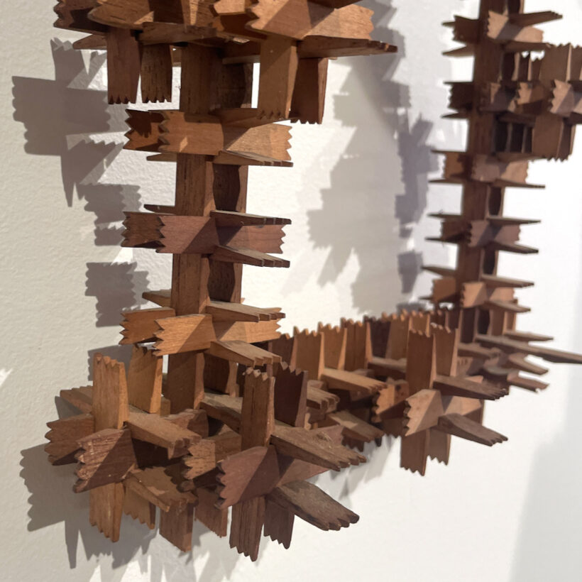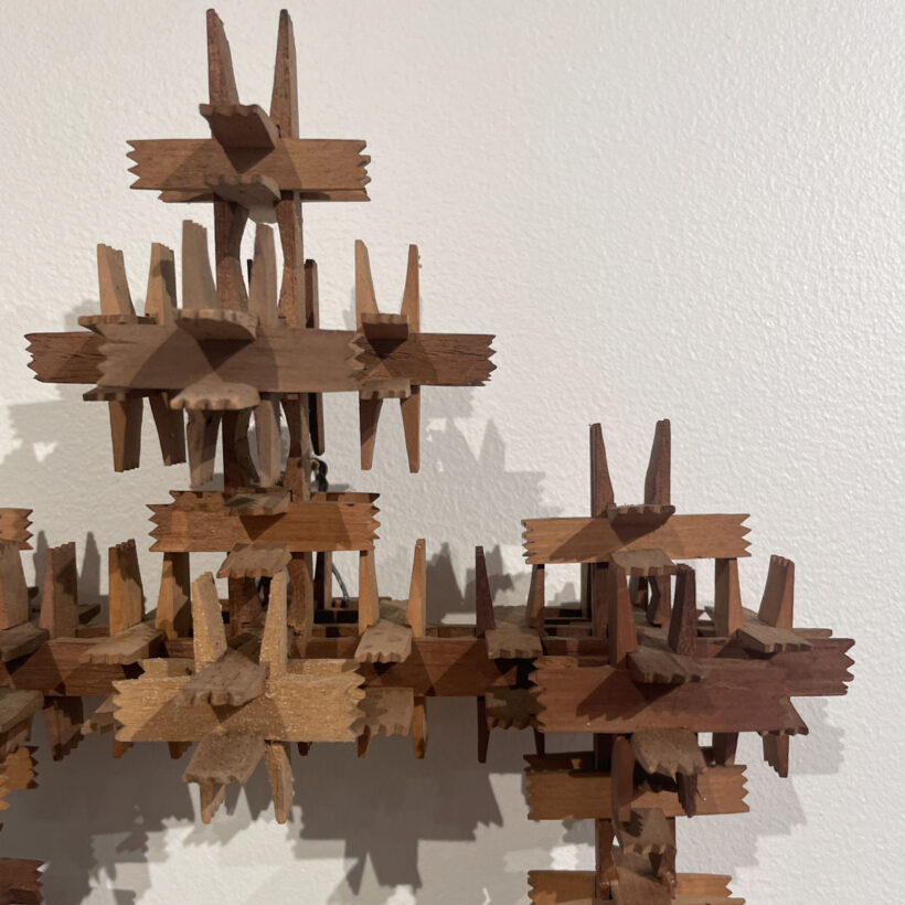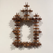 Folk art frame of puzzle-box construction composed of tiny carved wooden pieces that snap together. Unusual diminutive size and exceptional design.