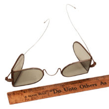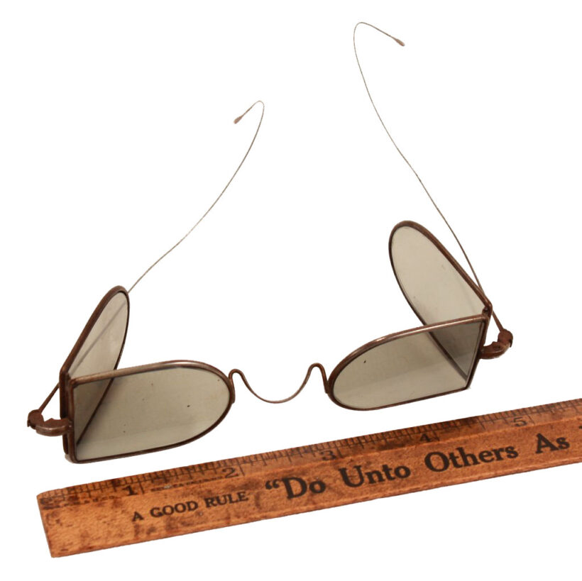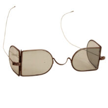 Rare antique Victorian “railroad” or “carriage” glasses intended for wear when traveling by rail to prevent airborne locomotive cinders from endangering the eyes, c. mid-19th century. Striking and sculptural design with folding side panels. Gray tinted lenses. Fully functional with bendable wire temples. One of the boldest and most inventive frame designs in history.