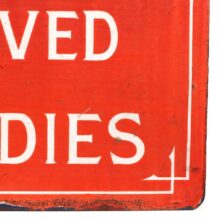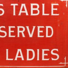This piece dates to a time in American culture when unaccompanied women in public settings were still unusual – and often the cause of concern for the moral high-grounders of the day. Spaces were often set aside for women in public places to protect them from the unsavory influence of men, such as the “Ladies Parlors” found in contemporary department stores and train stations. Gender segregation must have seemed especially important in a social setting like a dance hall where the point was for men and women to intermingle, and the serious size and hefty weight of this piece seems to speak to a desire to control the interactions. Dance halls – along with the liquor served at them – were the common targets of those self-appointed defenders of late 19th century womanhood, who argued that the purity of women could only be secured in the bosom of family and safety of home. Although one could say the sign represented a male attempt to circumscribe the behavior of women, one could also argue that this object lit some of the first flames of women’s liberation, however constrained to a particular table, and created a space where women could dance, flirt, and drink as they pleased in public. The piece is an important piece of Americana and may be the only one in existence of its kind.