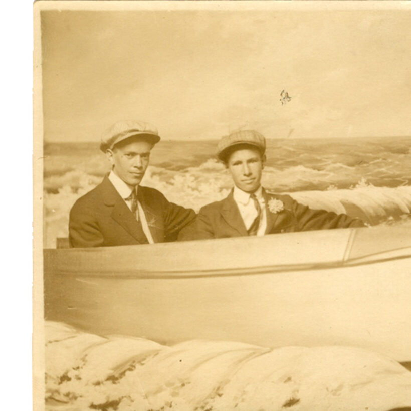 Real photo postcard of two men (a couple, perhaps?) riding in a painted two-dimensional “Rocket” on a painted sea, c. 1910s.