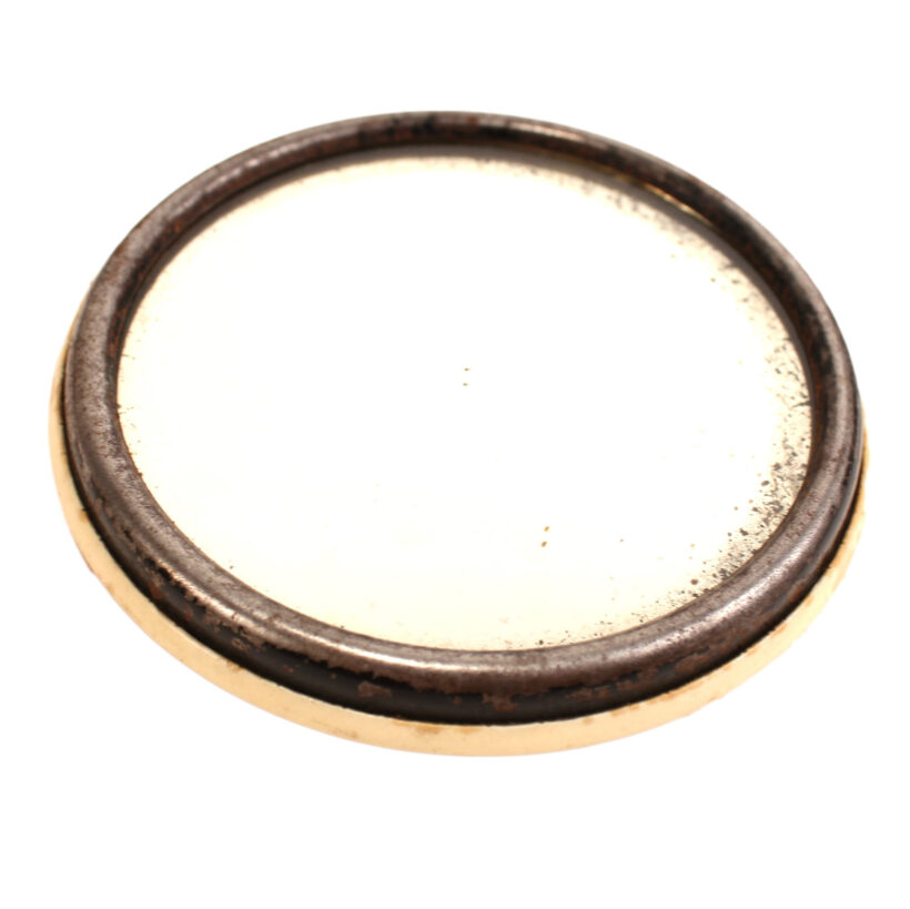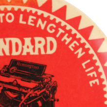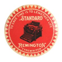 Miniature mirror advertising the Remington Standard Typewriter, c. 1910s. The piece was likely given out to female secretaries or typists to tout the latest technology in business machines championed for their efficiency and speed. Sized to fit in the palm of one’s hand and likely intended for placement on a desk, Remington’s trade stimulator reflects time passing as measured in its owner’s visage. With the bold motto, “To Save Time is to Lengthen Life,” technology is presented as a means to slow the aging process reflected back in the mirror and a typewriter held forth as capable of creating time itself.
