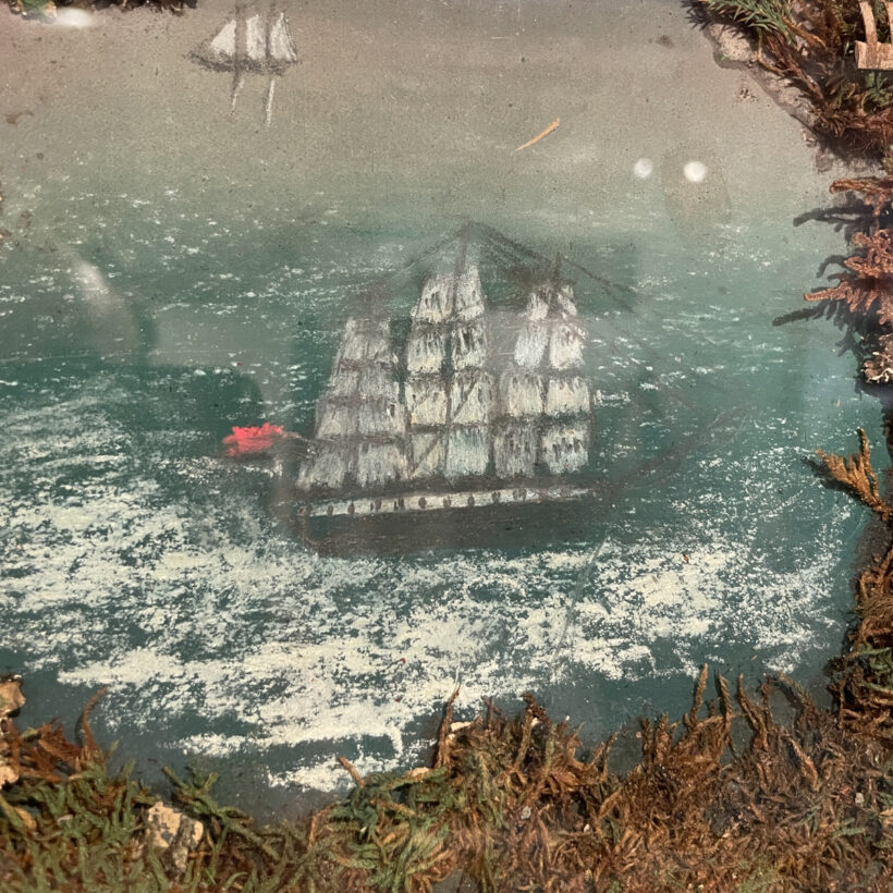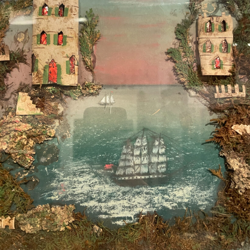 Ocean vista diorama depicting cliffs made from moss and lichen surmounted by birchbark buildings, all mounted on a pastel-illustrated background. The windows sparkle with interior red foil. Original frame.