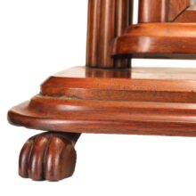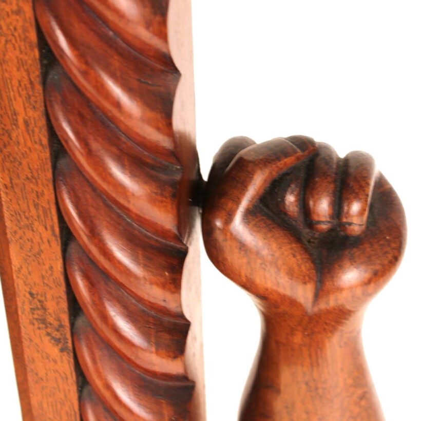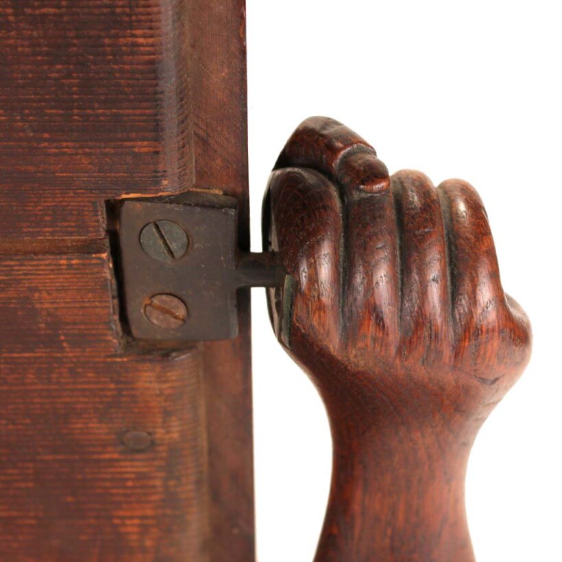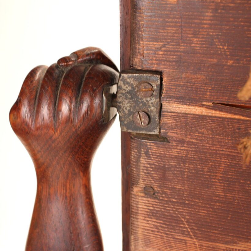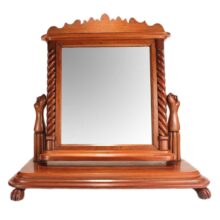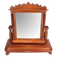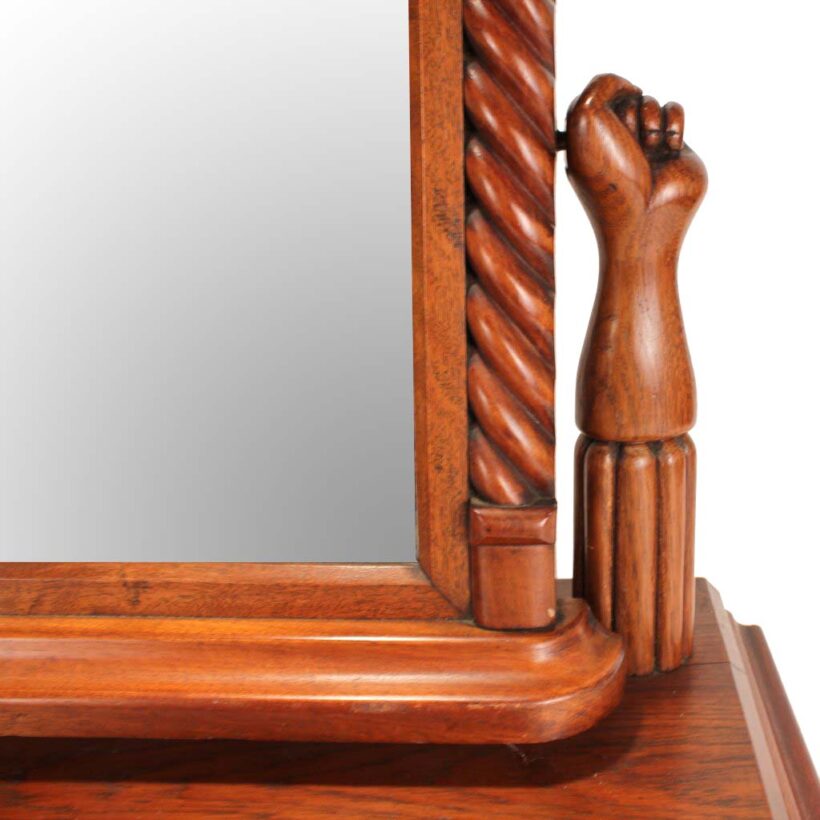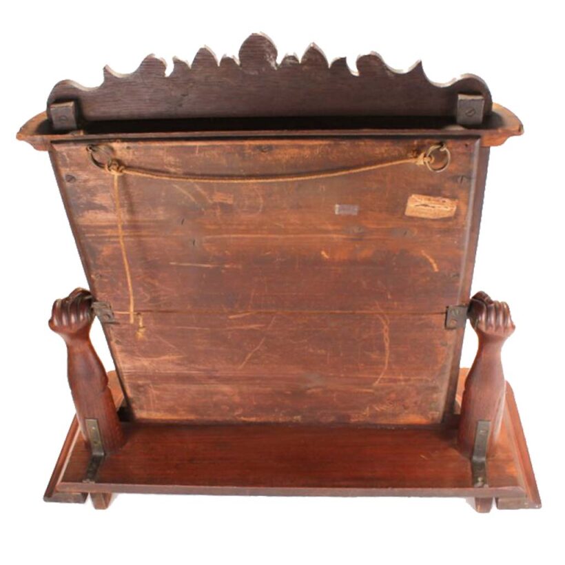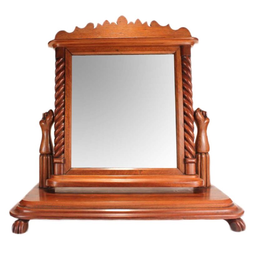 Antique folk art dressing table looking glass with carved hand supports, probably cherry wood, c. third quarter 19th century. The mirror is distinguished by its unusual and dramatic carved pillars, which take the form of clenched hands and hold up the looking glass like arms. The inventive form and fine quality of the dresser mirror extends beyond the arms, however, with barley twist pilasters flanking the glass, a coved perimeter on the pedestal, paw-like feet, a curvilinear crest, and a thick beveled looking glass, all indicating the piece came from the workshop of a gifted woodworker.