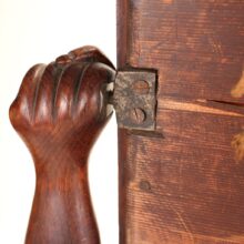 With the hands holding the glass up to our face, you could say the piece is kind of like an analog “selfie.” But is the image we create within its frame really our own? Though you may believe the reflection in a mirror or the picture on an iPhone screen is of yourself–held up by your own hand and reflecting your true nature–this looking glass reminds us that the person you perceive as yourself in that reflection is not you or a person at all. Like Narcissus at the pool, we mistake the images of ourselves as real, and whether we love or hate what we see in those reflections, the images emerge from the silvered glass or glowing pixels as not representations of ourselves, but rather virtual extensions of our own identity. Poolside, we are consumed by the need to perfect the selfie, to seek approval of its curated pixels, and life becomes a filtered facsimile existing for the sake of its own reflection. Before this dressing table looking glass each morning, you prepare to present yourself to the world, and although it stays at home within the bedroom, you hold the mirror up to your face wherever you go, obscuring who you are from others and also yourself. The mirror reminds us not to mistake the shadows and light of an Instagram selfie or medicine cabinet mirror for who we are. The looking glass raises itself to our faces with hands we must not mistake for our own.