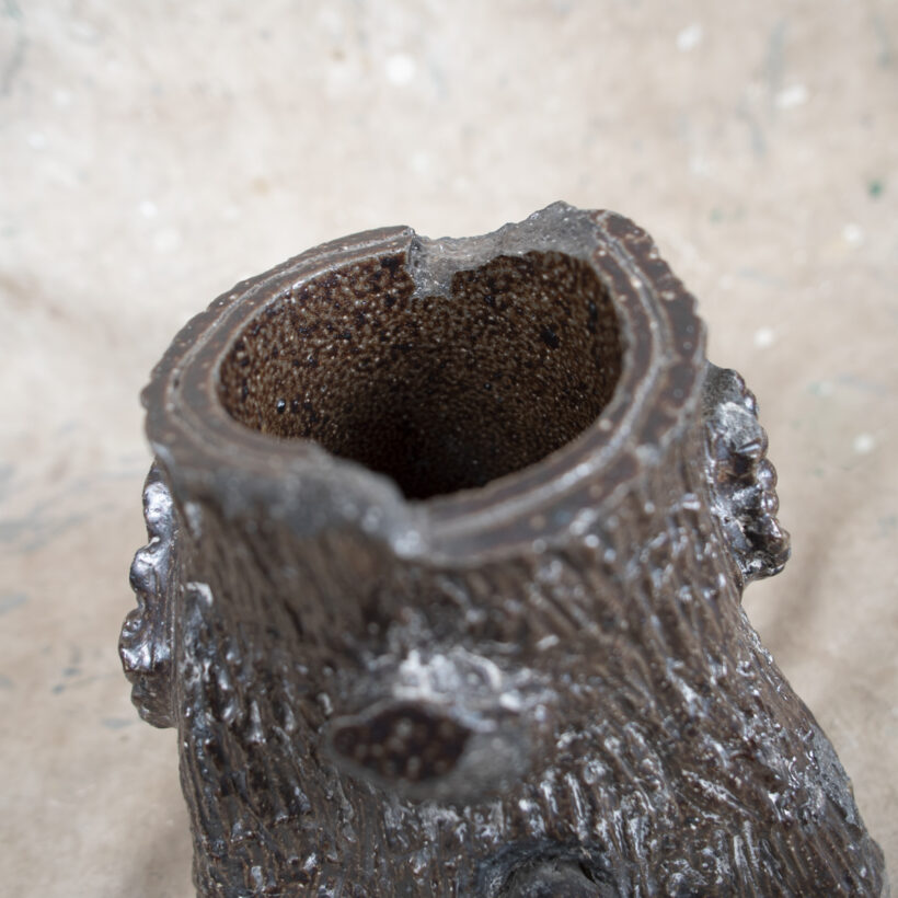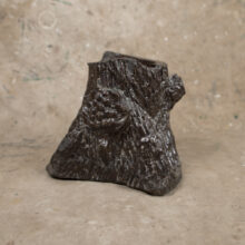 Handmade trompe l’oeil planter sculpted from sewer tile clay. With striated surface to imitate tree bark, berries and cut branches grow from the trunk, and a squirrel pokes his head out from a hole in the roots.