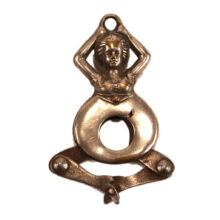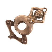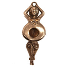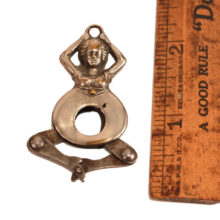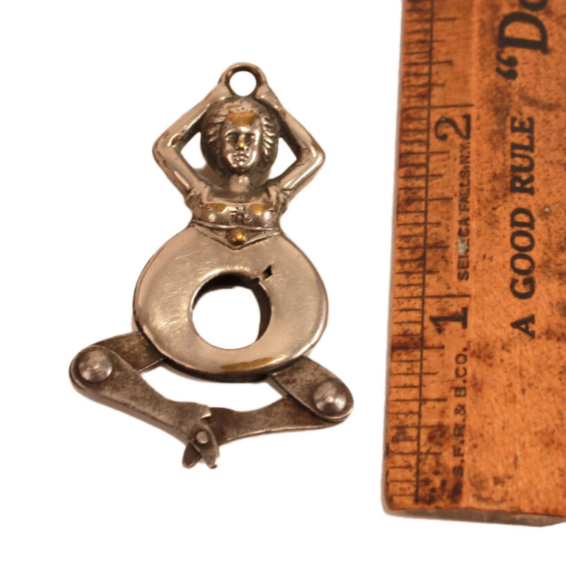 Rare risque nickel plated brass lady cigar cutter, c. 1900. Pressing her jointed legs together closes the cutting blades located in the…ahem…opening in her torso, the action snipping off the tip of one’s cigar or cigarette. Designed as a fob, she would have hung from the pocket watch chain of some ribald gent. Still limber as ever and ready to cut your cigar.