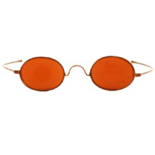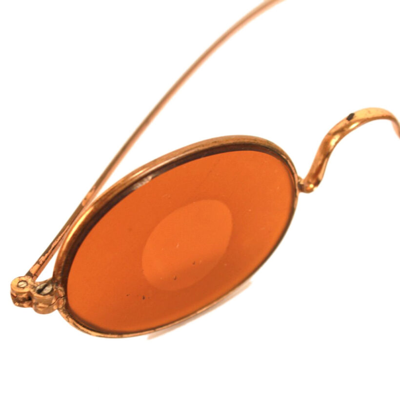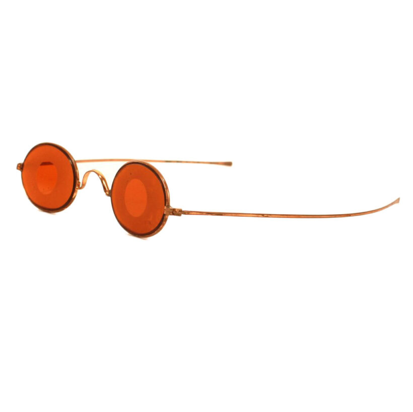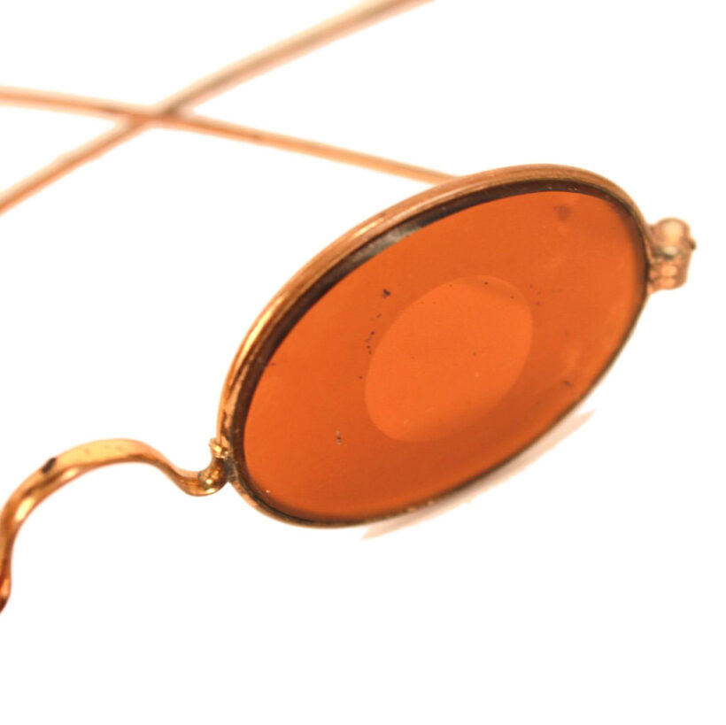 Antique Victorian tinted amber spectacles used for shooting and hunting, c. late 19th century. These eyeglasses are acid etched around the edges, creating a clear circle at the center which sharpens and directs the gaze while the color has the effect of brightening the landscape. Unusual and high quality copper alloy frame. Both a sculptural objects and wearable eccentric glasses.