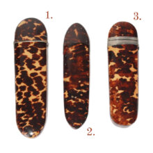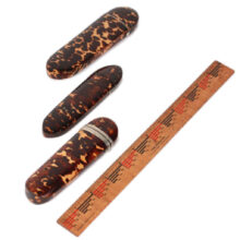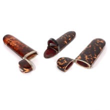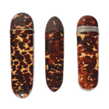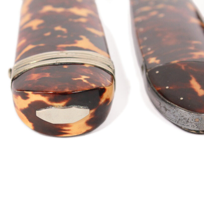 The shell cases are exquisitely made and in excellent condition considering their age, with silver banding and cartouche, silver hardware, and flip-tops. With the rich color and translucent depth of the tortoiseshell, each glows in the light. They are extraordinary survivors considering the fragility of their delicate shell casings.