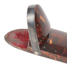 Rare early “wig” spectacle cases made of tortoiseshell, likely English and dating to the late eighteenth and early nineteenth centuries. Sold individually. The cases were designed to hold delicate eyeglasses — also made of shell — which had shorter temples so as not to interfere with one’s powdered wig, hence the term “wig spectacles.”