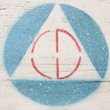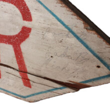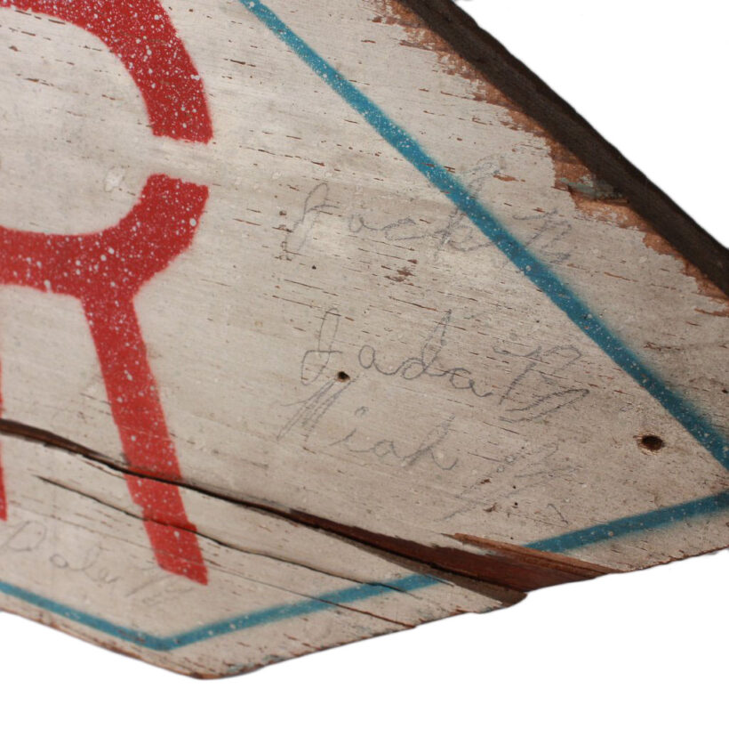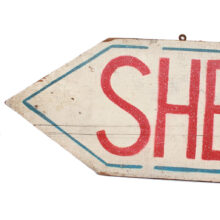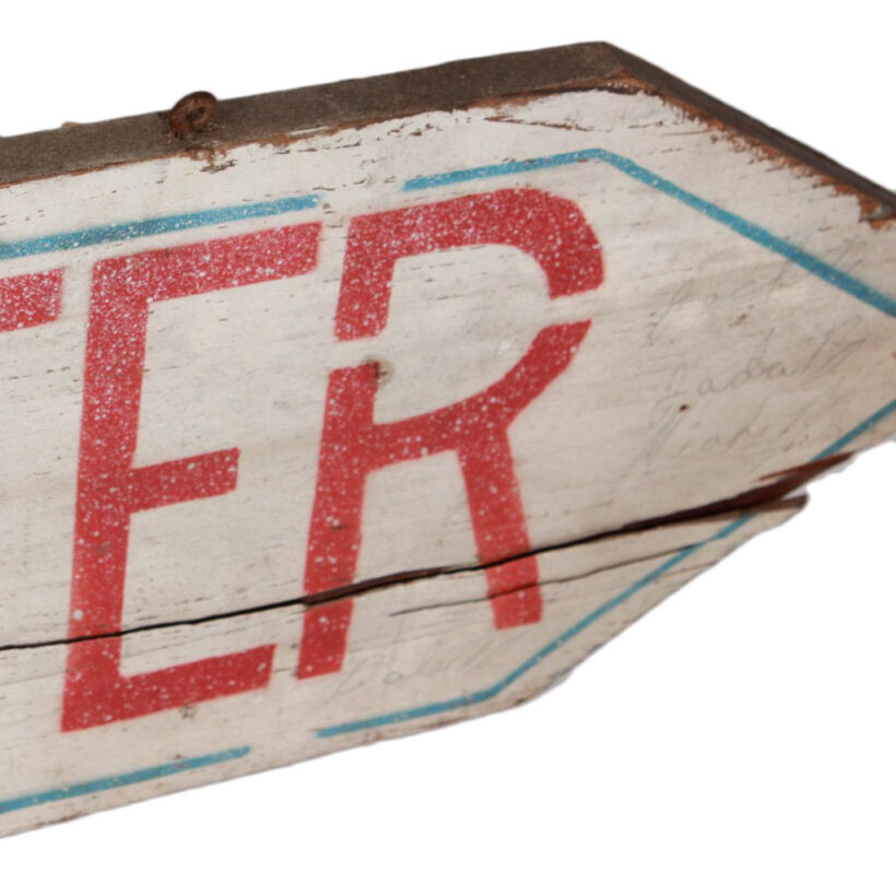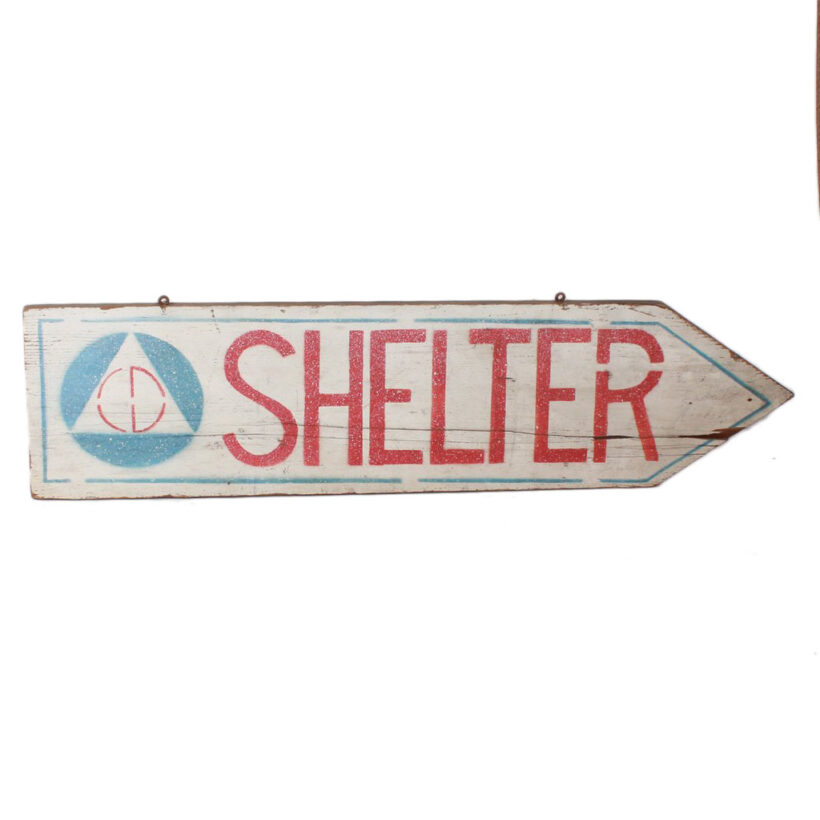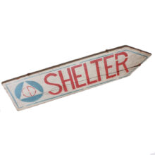 World War II Civil Defense air raid shelter sign, c. 1940s. Painted wood. Found on Cape Cod, where Federal authorities built infrastructure to prepare for the Nazi bombardment.