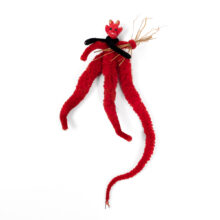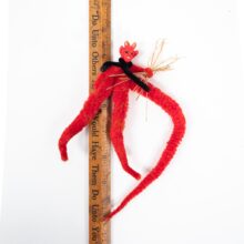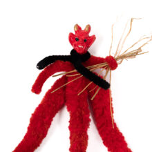 The scarlet body of this Krampus is made from plush wire brush, with a long, louche tapering tail. Ready to embark on his Christmas terrors, the beast wields birch splinters in hand.