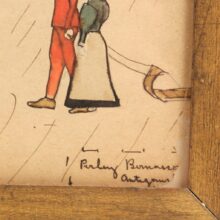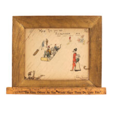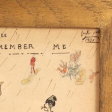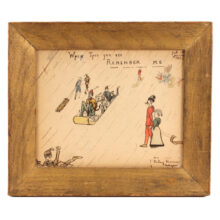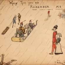 Antique folk art watercolor and pencil drawing of a whimsical winter scene, dated 1901. Careening down a snowy hill on toboggans or sleds, the eccentrically dressed characters look like they’re have a splendid time. Inscribed “When This You See Remember Me,” the piece was surely a gift, perhaps to a sledding companion. In the upper right hand corner the painting is dated February 1901.
