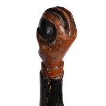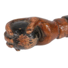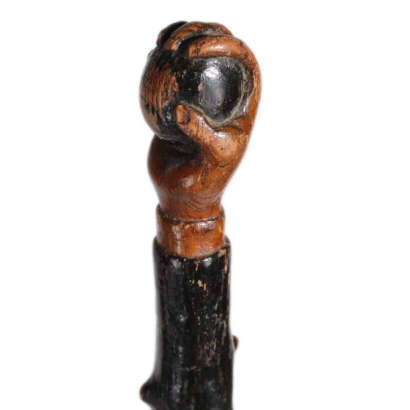 Exceptional antique folk art cane with snake-encircled shart and handle in the form of a hand clutching a ball, c. late nineteenth or early twentieth century. Unlike many folk art canes which were ornamental, this example was used frequently by its owner and is hauntingly timeworn.
