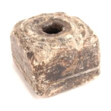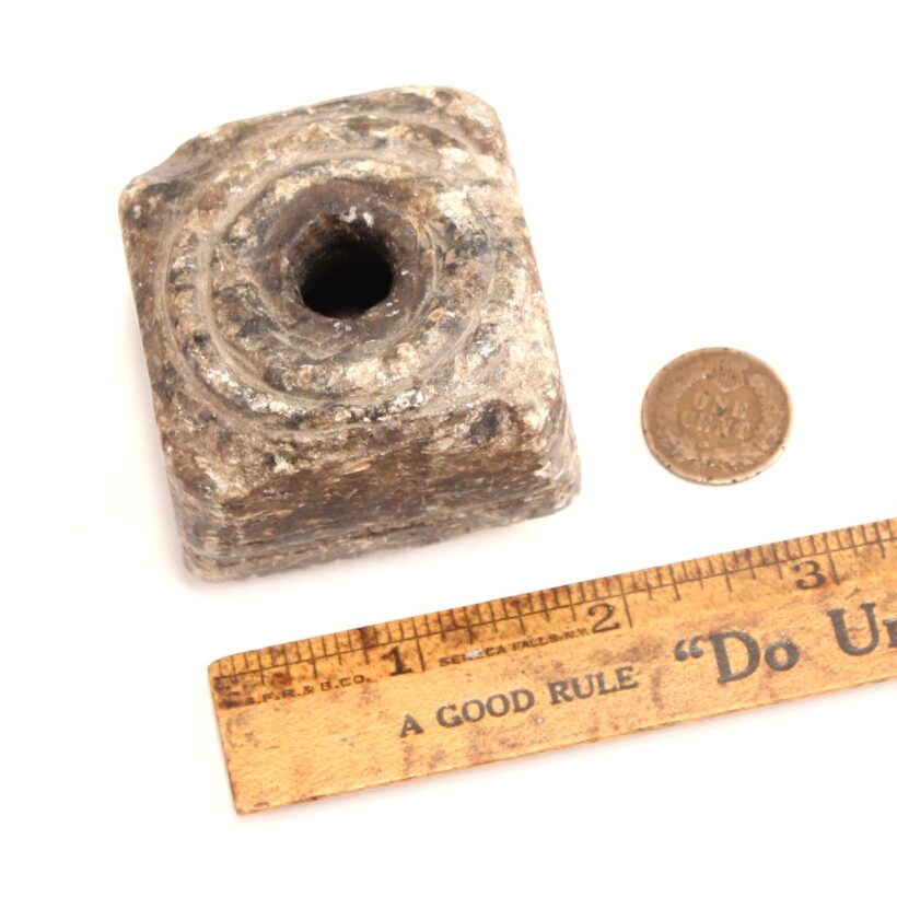Antique hand-carved soapstone inkwell, c. 1840s. The piece has tumbled through many a desk and fallen under many a pen, and has scratches and chips all of which add to its evocative character. A note on the bottom indicates the soapstone originated at a Francestown, New Hampshire quarry. How many creative quills dipped drank from its black well, composing so many lines ending in dust? But time-tumbled through the years, this stone resevoir remains, a contemplative object for the writer’s desk or bookshelf.