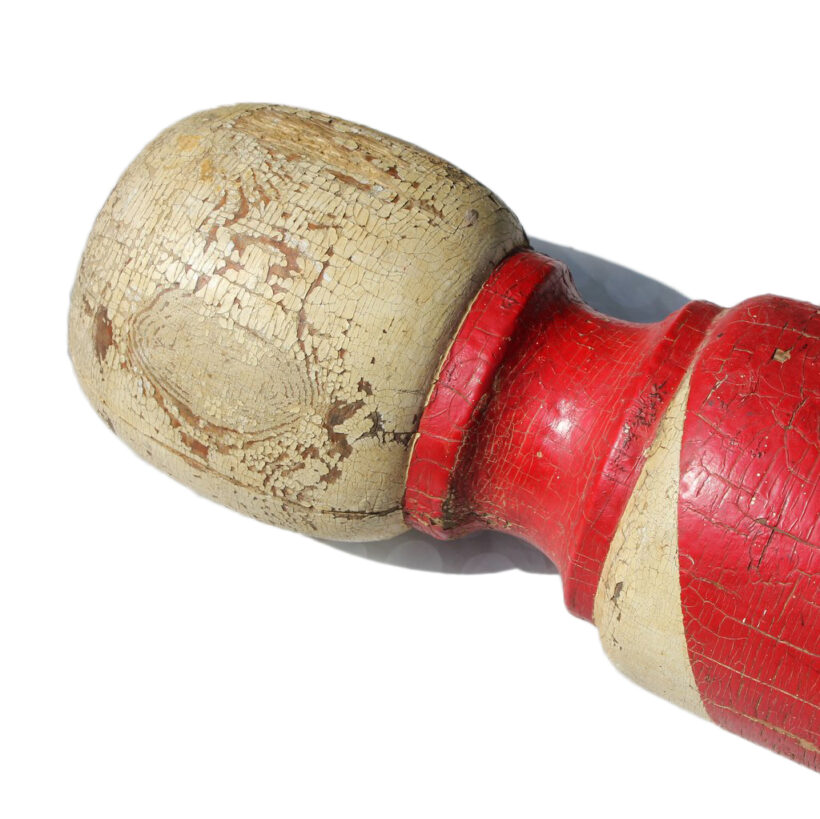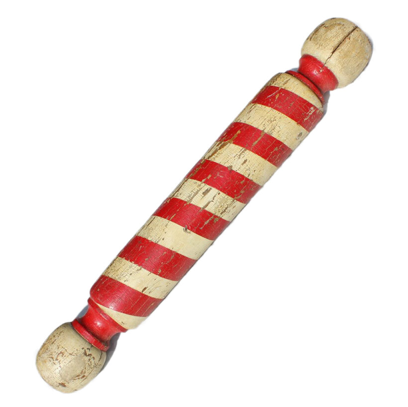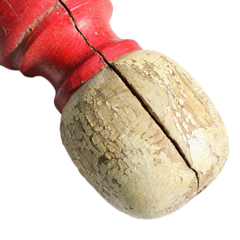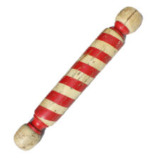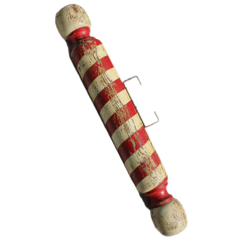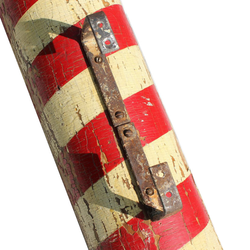 Antique turned and painted wooden barber pole, c. late 19th century. The red and white barber pole advertised more than a haircut in the nineteenth century. Barbers performed bloodletting as a standard service, and the pole’s red stripe possibly represented blood and the white, bandages. This example retains its original old paint and surface — a rarity, given these are often stripped and repainted. Many “antique” barber poles on the market are actually doctored and painted newel posts or other repurposed architectural features. Turned expressly as trade sign, this antique barber pole is guaranteed authentic.