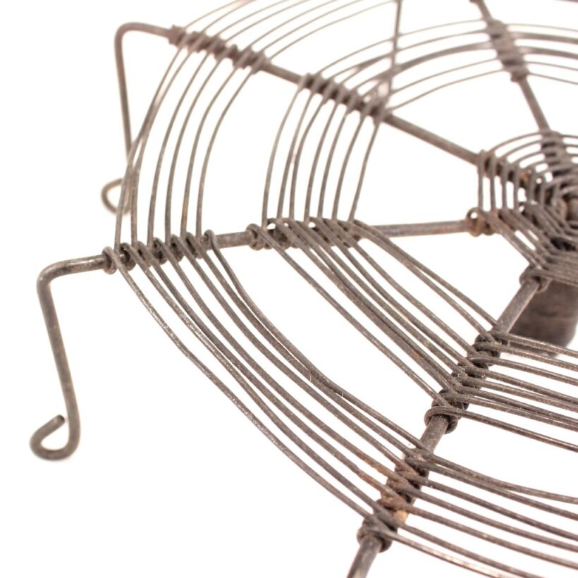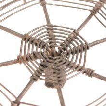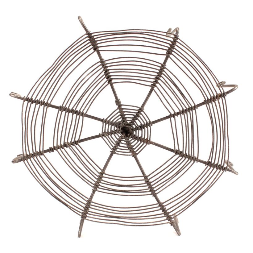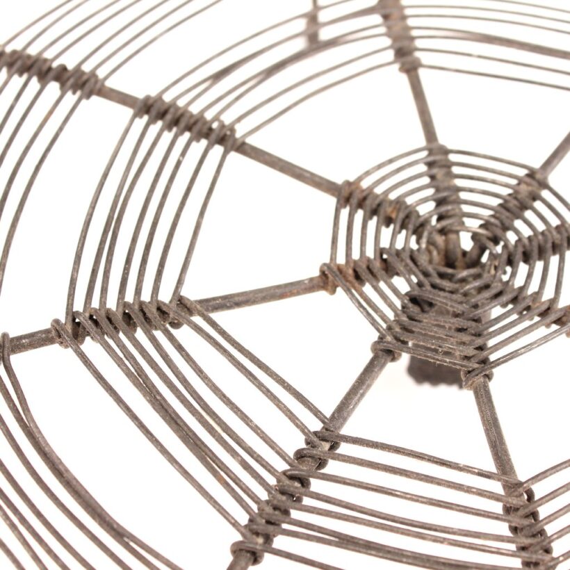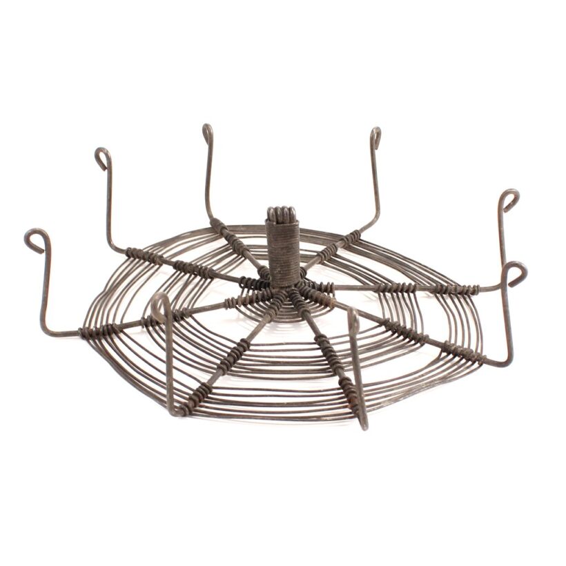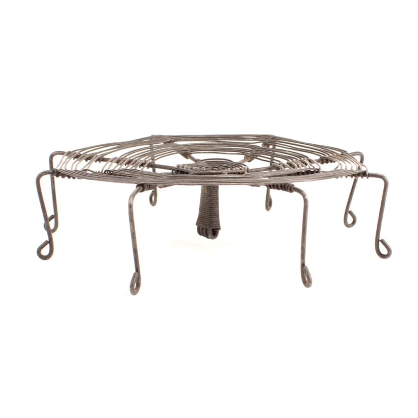 Antique handmade wire trivet in a spiderweb form, c. 1900. An inventive and ingenious design, the wire web catches your hot kettle or pot on its little curled wire legs before it burns your tabletop. Original purpose aside, the piece is a work of folk sculpture and a great example of the tinker’s craft.
