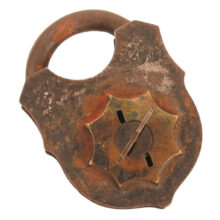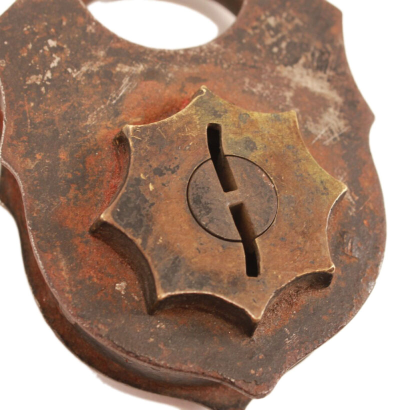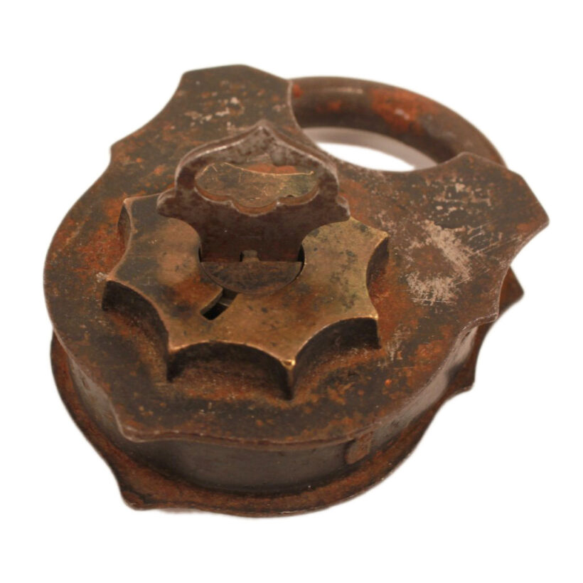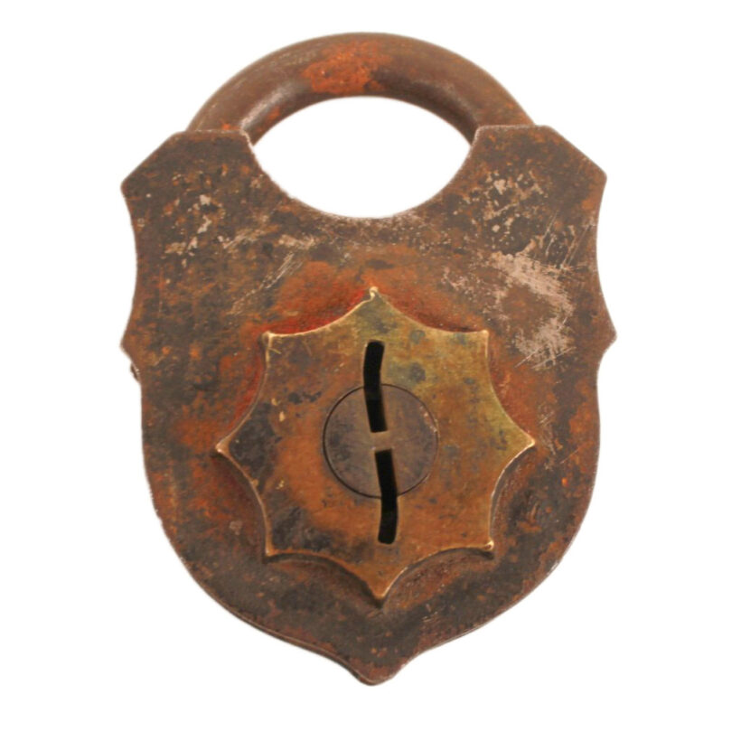 Antique Victorian padlock with key, c. 1870s. Striking design, with brass starburst escutcheon. Designed to be pick proof, the unusual double-turn key mechanism prevents access to the lock’s interior. Inserting the unusually shaped key, you turn until the key falls into the second interior keyhole, continuing until the lock opens. Sculptural form. Good working order.