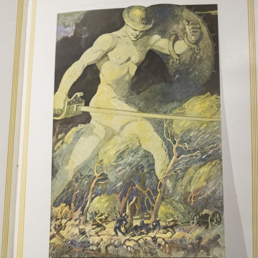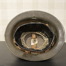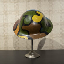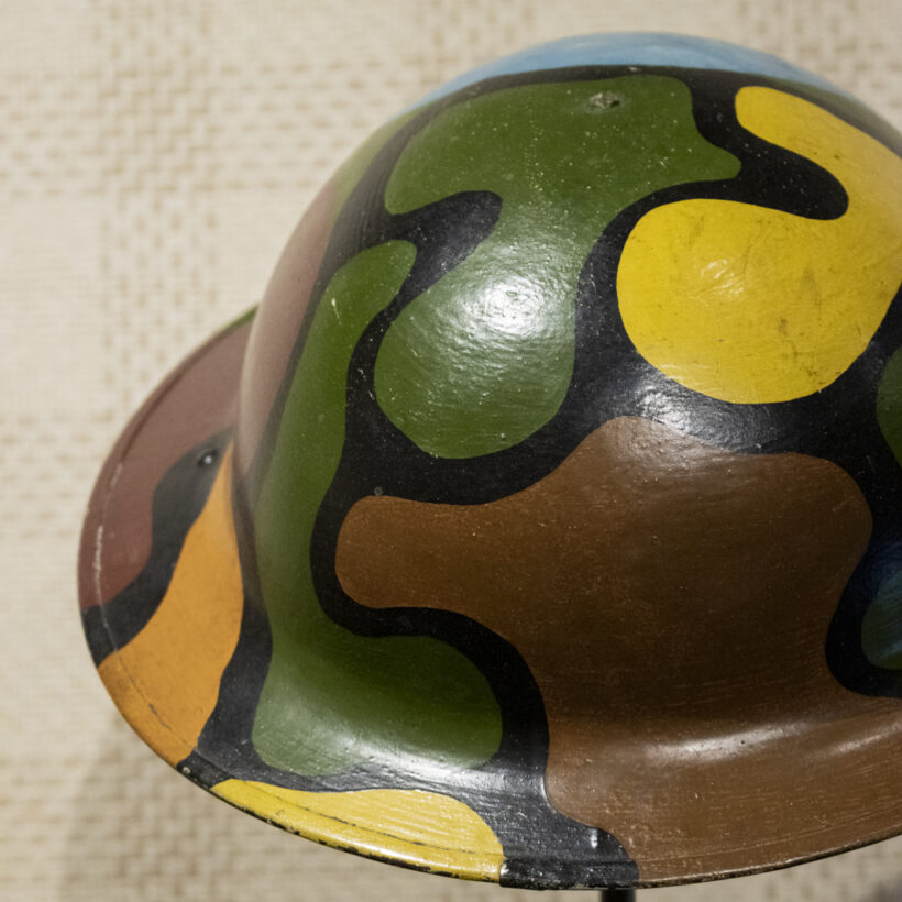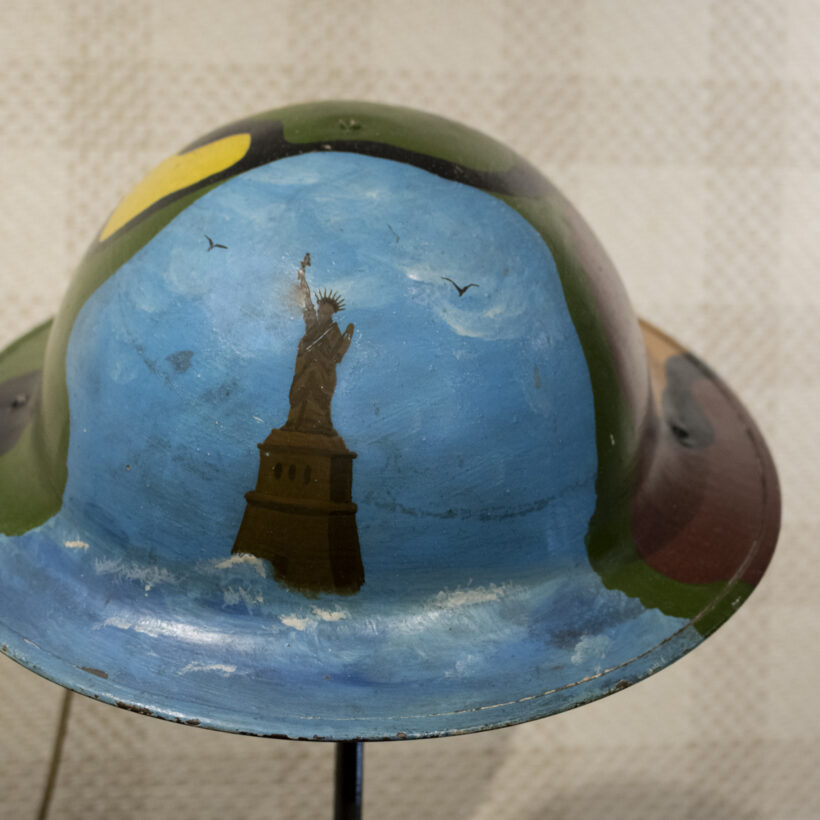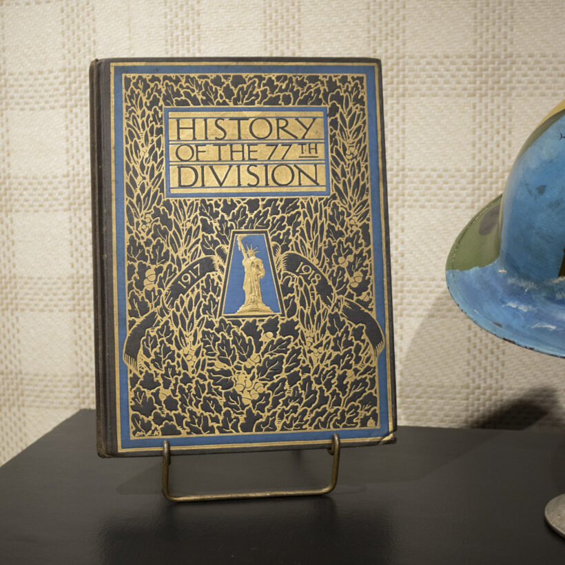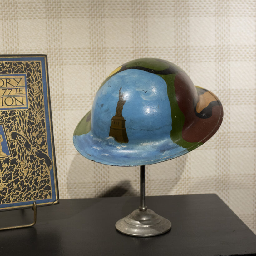 With the Statue of Liberty on the front and polychrome camouflage on the back, The helmet was either painted in the European trenches or en route back to the United States following the occupation in 1919. The piece is accompanied by an illustrated book on the history of the 77th Division with embossed cover and color plates.