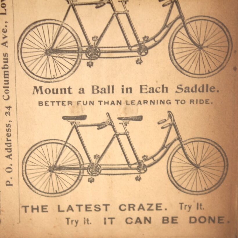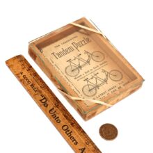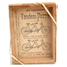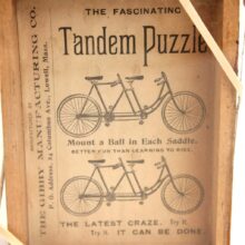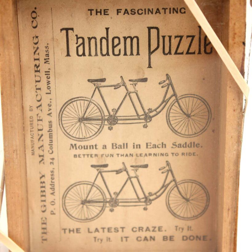Rare antique “Tandem Puzzle” bicycle themed dexterity toy with ball bearings, c. 1890s. Each seat has an indentation in which the player should seat the metal ball. Great images of tandem bicycles and Victorian typography. The toy has seen many a puzzler puzzle over it and at some point the adhesive holding the glass onto the game box came loose. Now it is held by rubber bands, which is how I came upon it. I think it all the more handsome in its well-played condition. The Latest Craze. Try It. Try It. It Can Be Done.