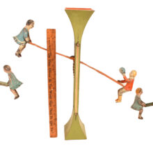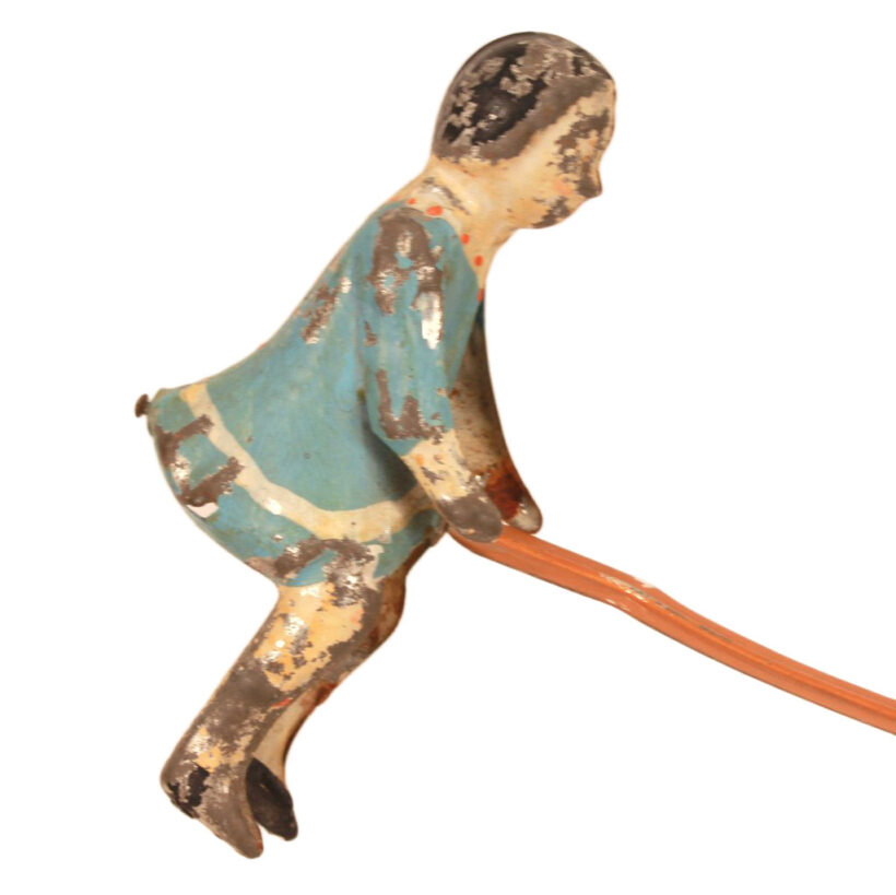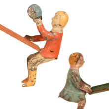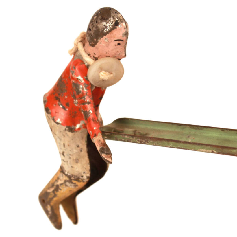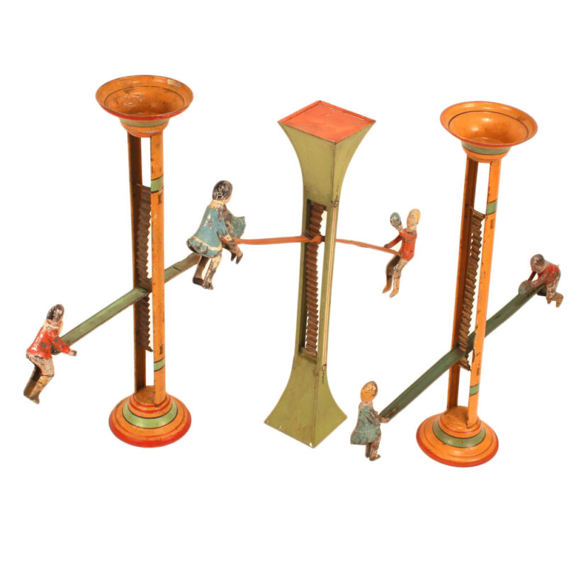 Three antique painted tin toy teeter totters or seesaws, German, c. early 20th century. The inventive toy design functions not unlike an hourglass: At either end of their seesaw, the figures move up and down with gravity, descending one rung at a time (and with a satisfying tinny “thunk” sound). When they reach the bottom, one simply flips the toy upside down — or should we say rightside up — and the figures swivel upright and the seesaw once again begins its downward progression.