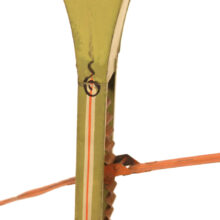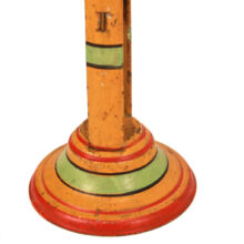 The teeter totters have great color with original paint. I especially love the form of the lime green and orange one — the elegant profile and sparse painted decoration raise it to an object of sophisticated design. The figures on all three of the toys are essentially the same, though one long ago was outfitted with a mother of pearl button as a necklace — presumably to better counterbalance the seesaw.