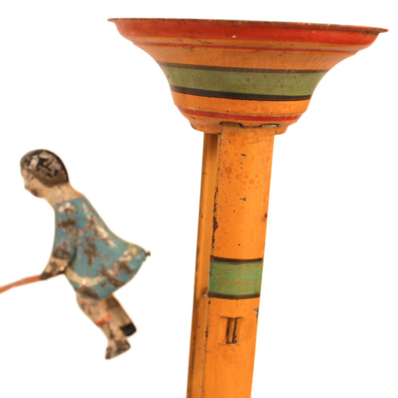 Very good antique condition with some paint loss (especially on a couple of the figures) and minor bends in the seesaws. The toys are all functional, though may stop halfway down and need a push. A dab of oil would have them descending flawlessly, but I wanted to keep them as is in order to display the seesaws at various levels.