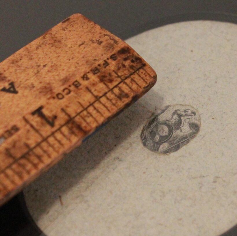 Given the decentralization and resulting chaos of the nation’s early monetary system, this microchip of a Washington was perhaps designed as an anti-forgery security feature and also to insert subtle federal authority into each of the thousands of currency designs in the pockets of antebellum Americans. Two hundred years later, the American Bank Note Company has been rebranded as ABCorp, but still employs ever more subtle security features, offering contactless credit cards, mobile phone payment services, and financial security protections.