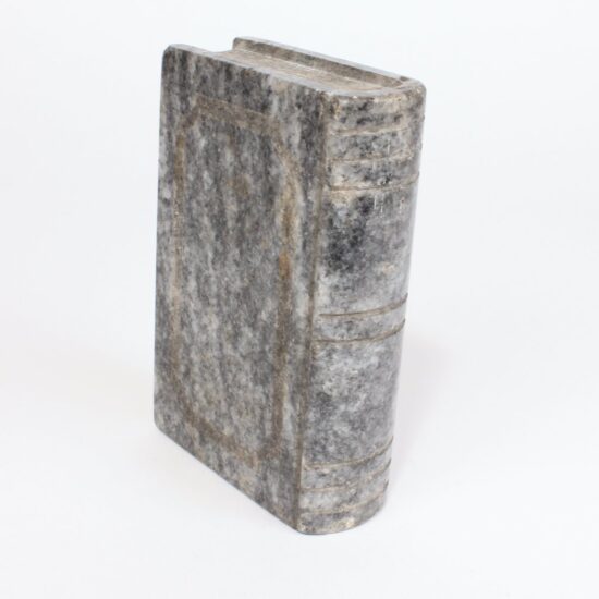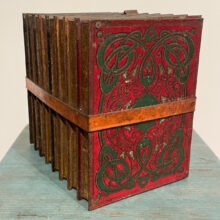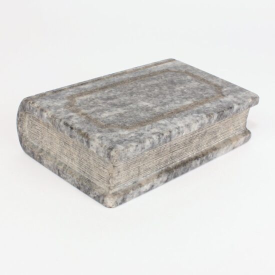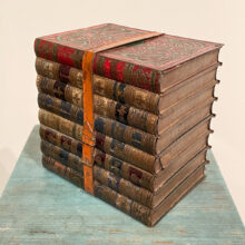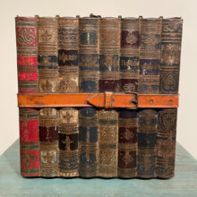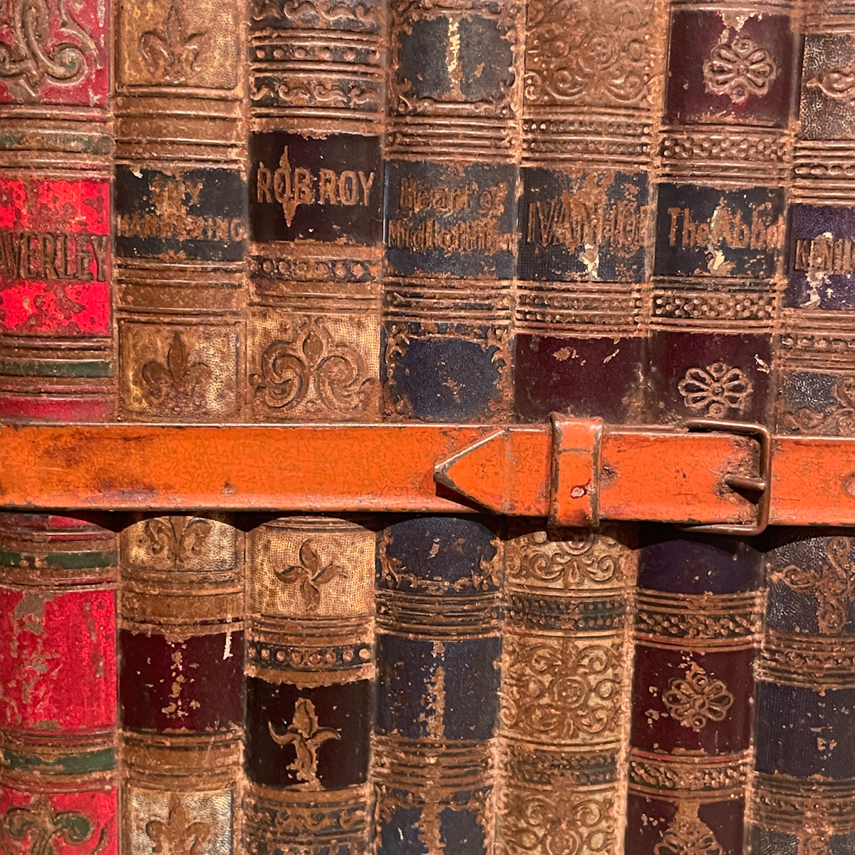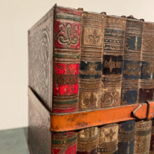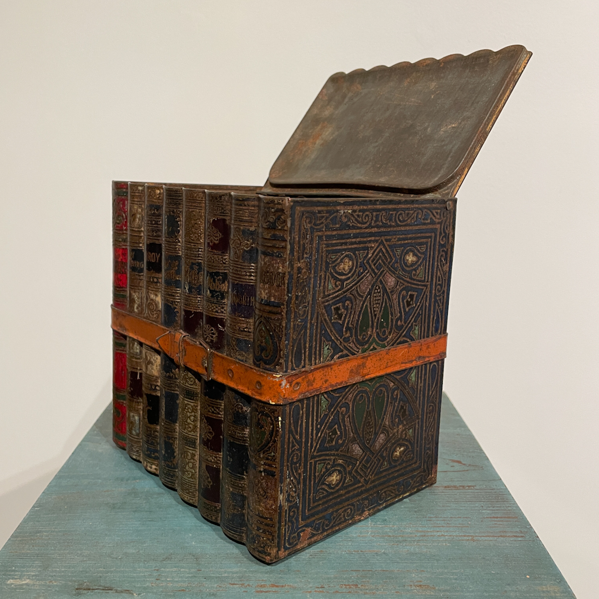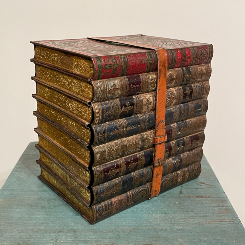 Rare trompe l’oeil box imitating a stack of leather-bound books but made entirely of embossed tin.