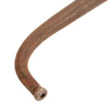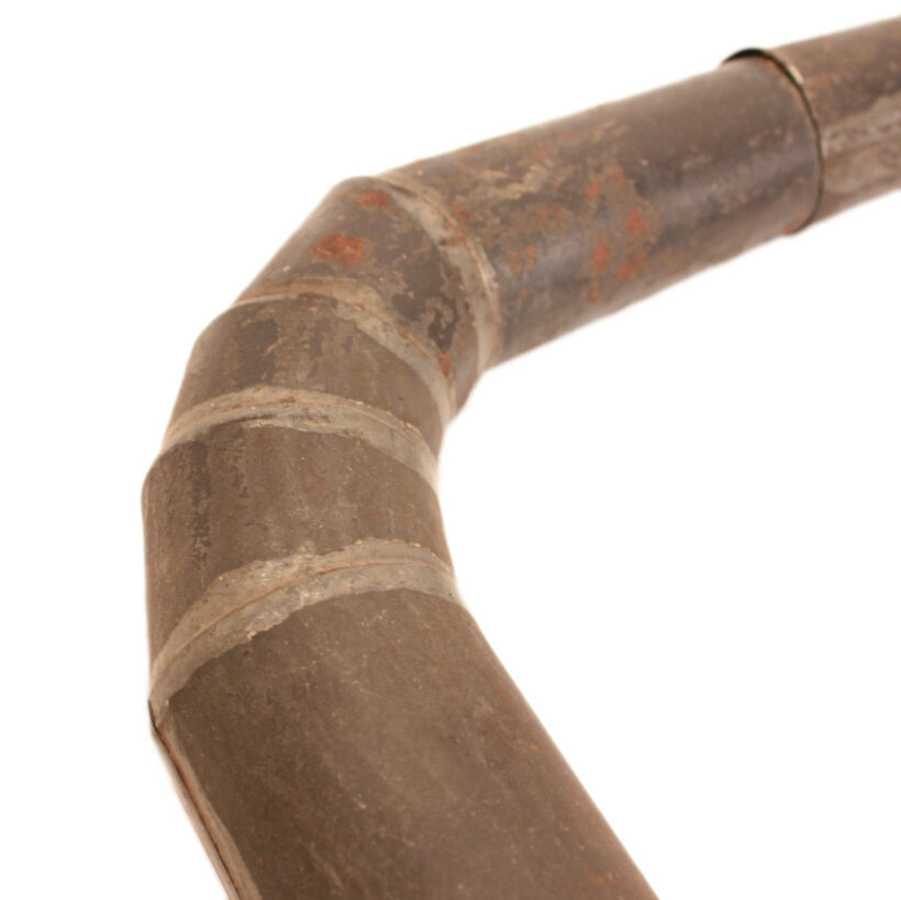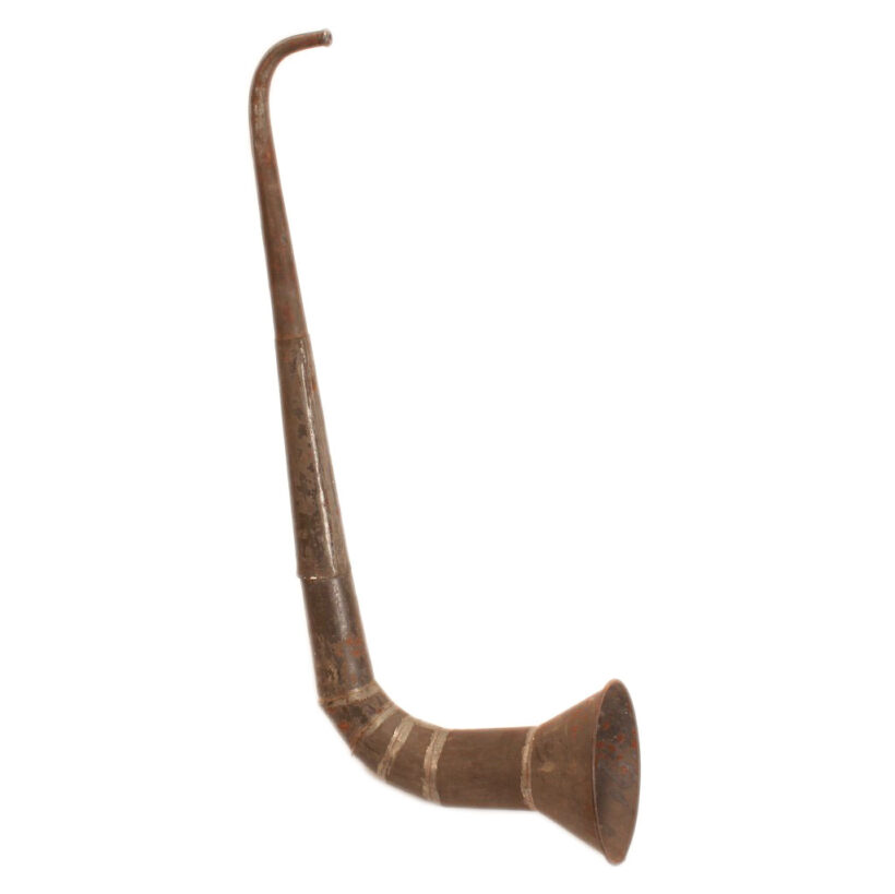 Early tinsmith-made ear trumpet, Pennsylvania, c. mid-19th century. The antique hearing aid may seem primitive, but you may find it surprisingly effective (though perhaps a bit more obstrusive than modern devices). Great sculptural form with raw tin surface. The piece comes apart in two pieces, allowing for repositioning of the talk end as desired. It was likely made by a tinsmith who added the inventive device to his standard inventory of tin plates, cups, and boxes, often sold by itinerant salesmen travelling house to house in rural America. I would have liked to hear the hard (of hearing) sell that landed this ear trumpet with its first user.