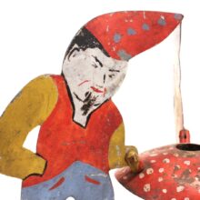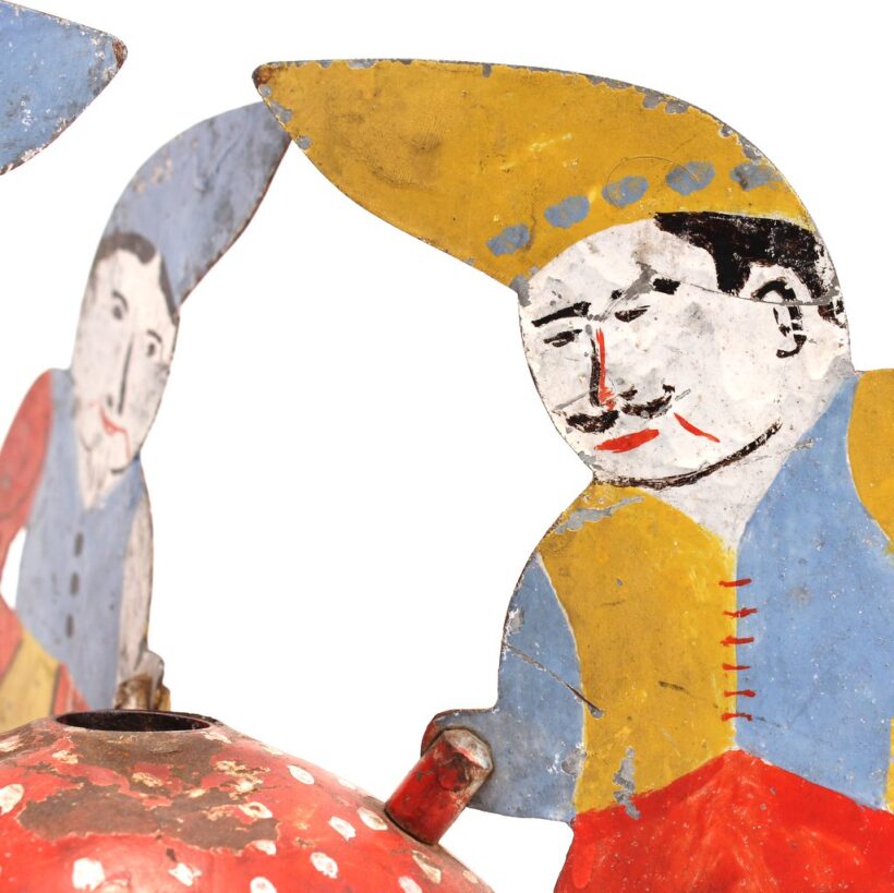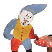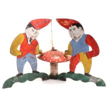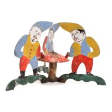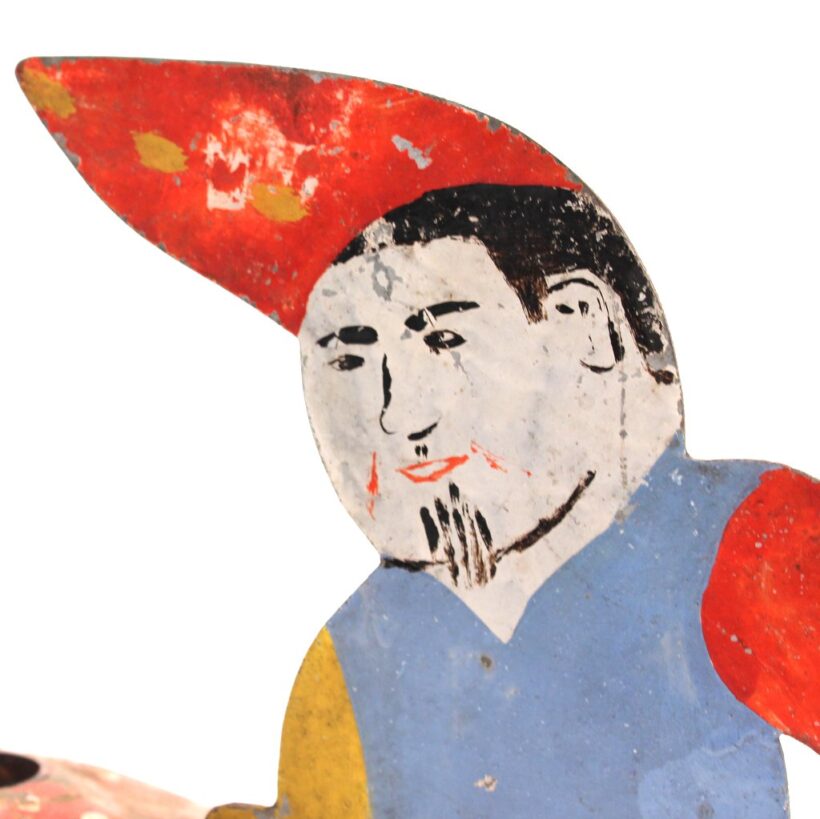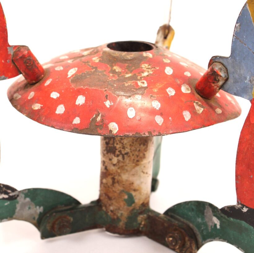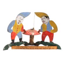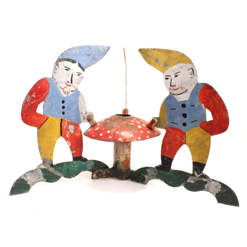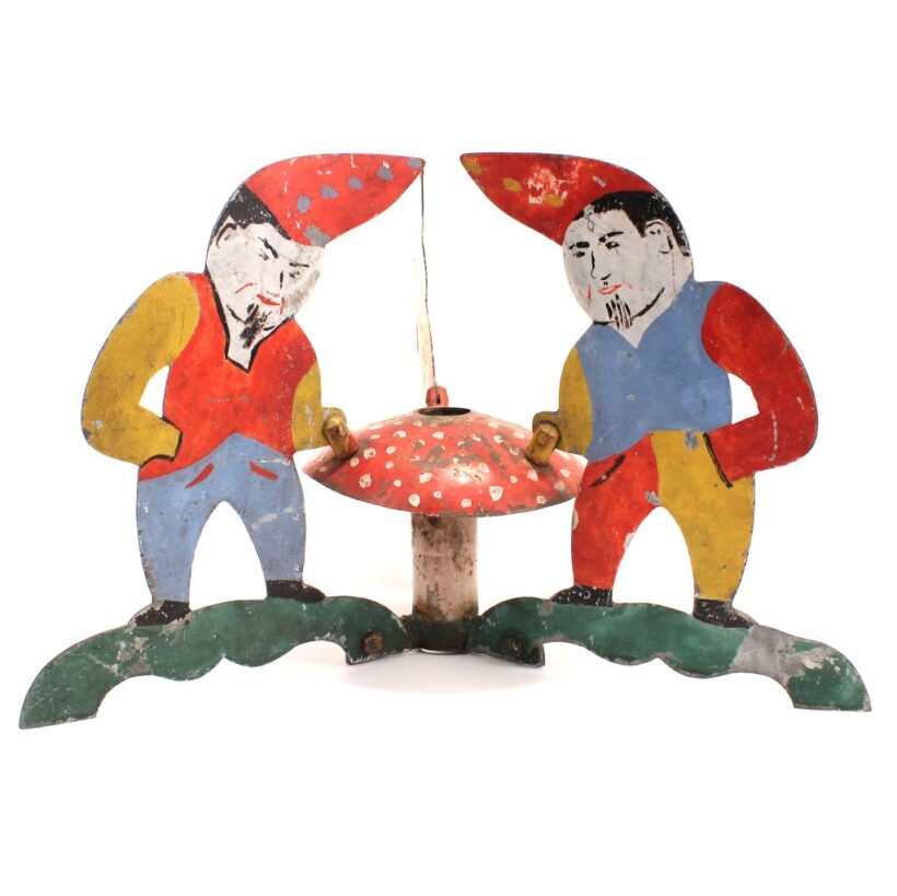 Antique folk art hand-painted sheet metal elves and mushroom stand, likely a homemade Christmas tree stands, c. 1920s. Great color and folk faces, with each side depicting a different elf character. A hole in the mushroom allows placement of a (small) tree. A fun and unique piece of vintage Christmas folk art. Found in Maine.