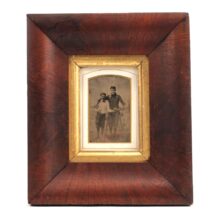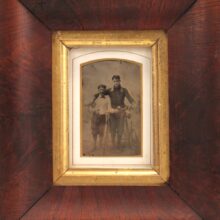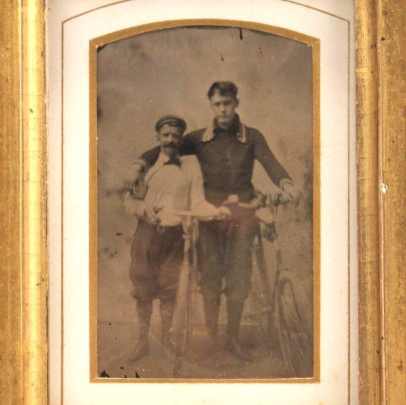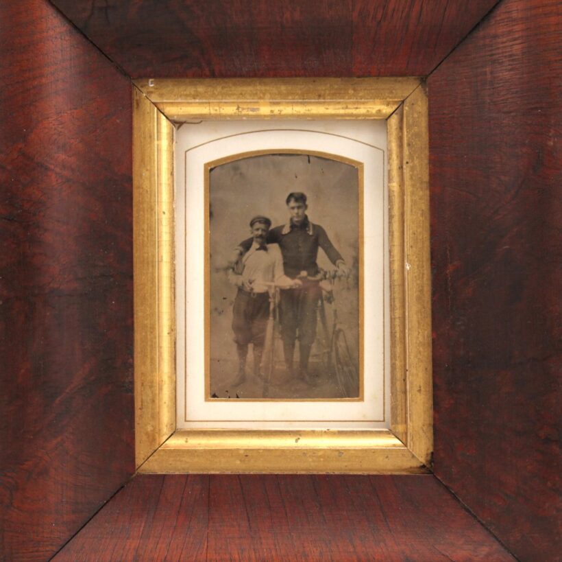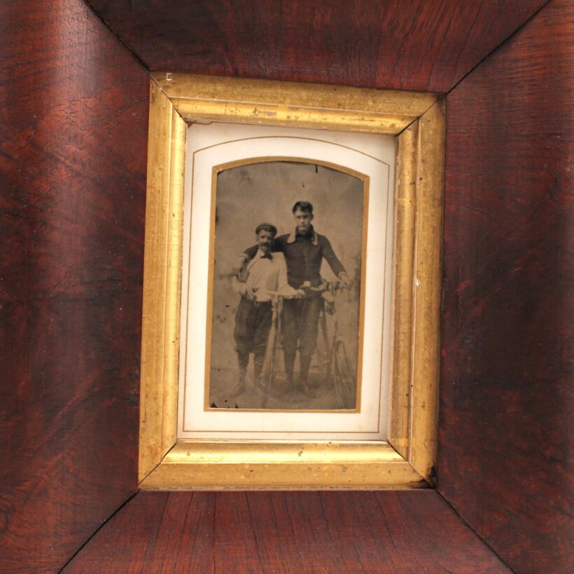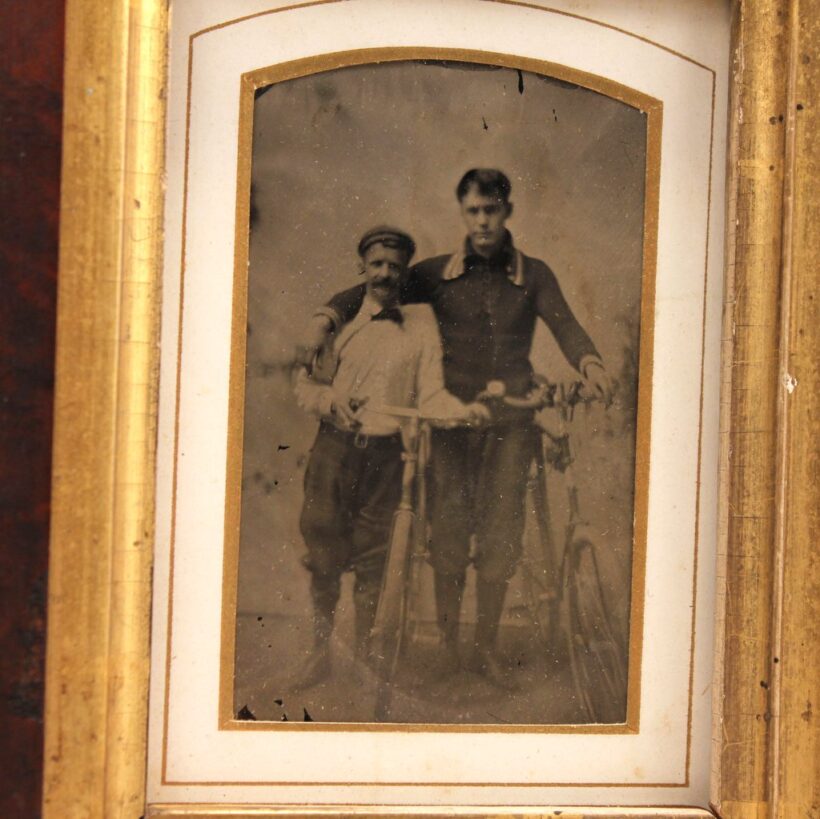Antique framed tintype of bicyclists, c. 1890-1910. The frame is earlier, dating to the mid-19th century, but works well with the photograph. A charming early bicycling image.