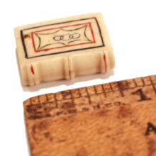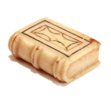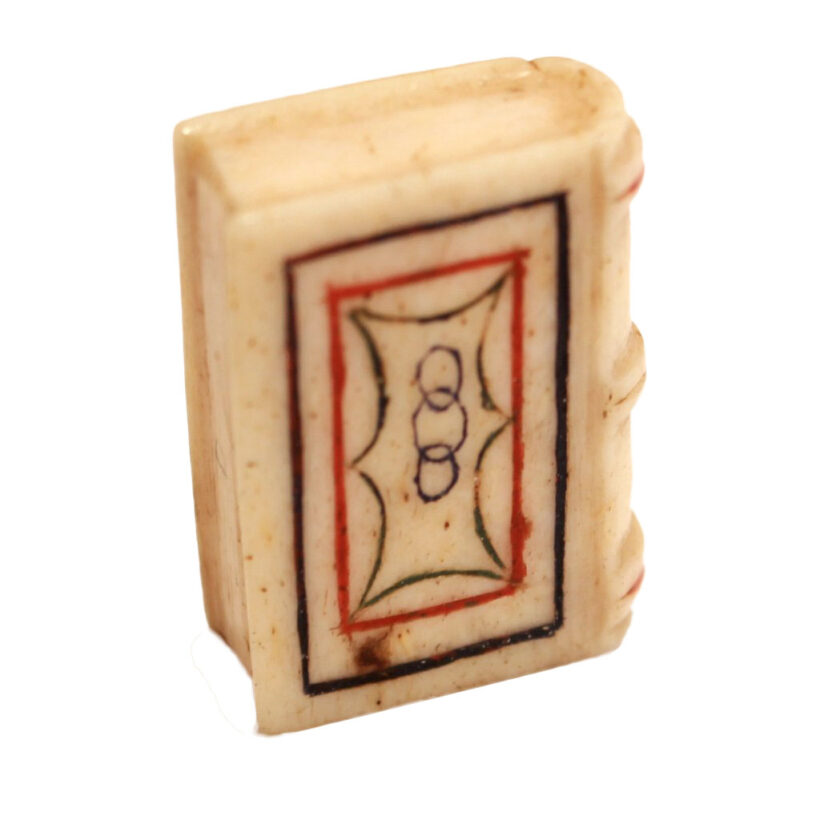 Hand-carved miniature bone book carved by an Odd Fellow, c. mid-19th century. Thumbnail-wide, the cover of the tiny volume bears the standard of the Odd Fellows, the three-link chain, symbolizing “Friendship, Loyalty & Truth.” A curious and mysterious piece of American folk art.