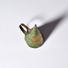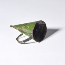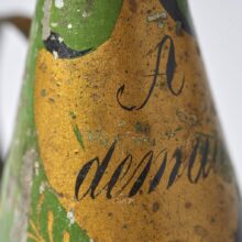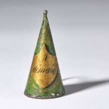 ExquiseĀ French tinsmith-made toleware candle snuffer, hand-painted with parting words “A demain” (goodbye until tomorrow). Emblazoned with the rays of the next morning’s sun, the green and gold snuffer gently promises a new day even as it renders the flickers of this one to smoke in the night.