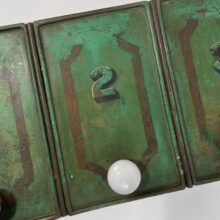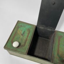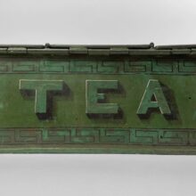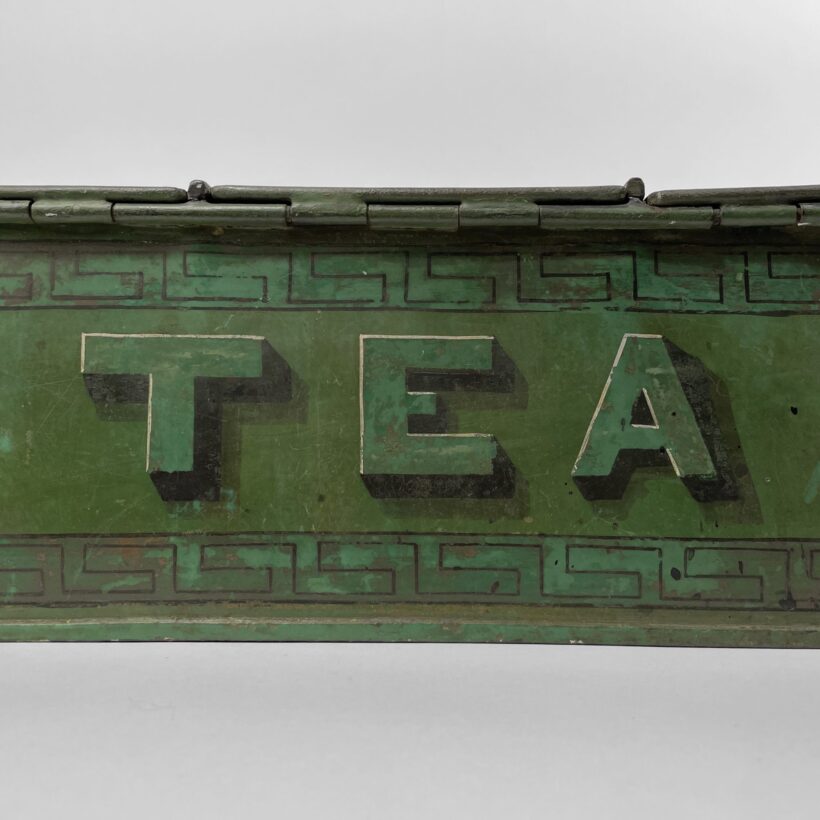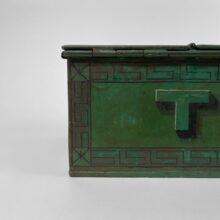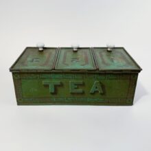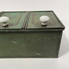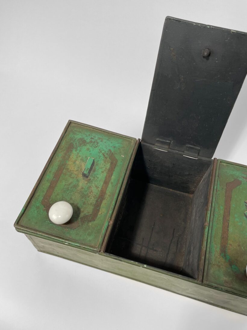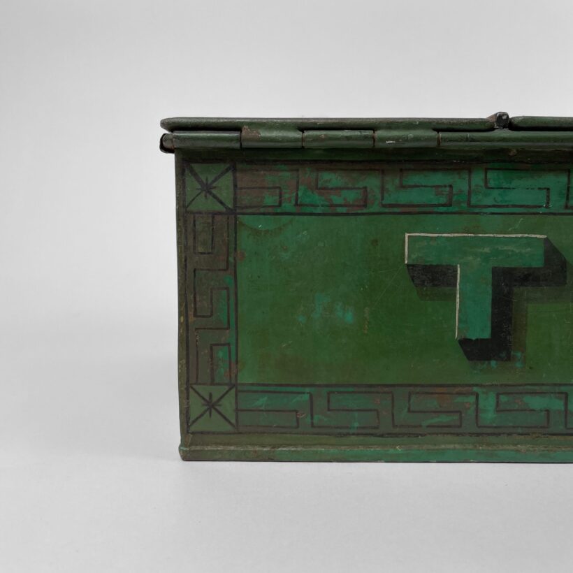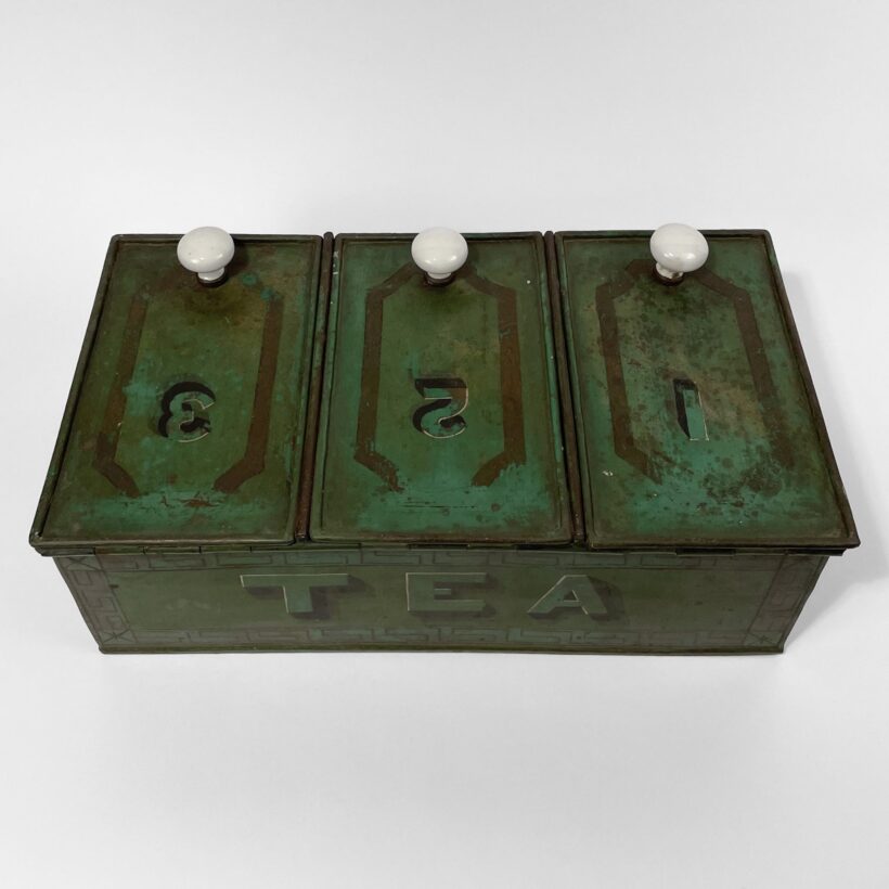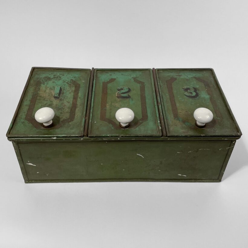 Painted tin toleware tea chest likely from a store, c. 1860s. Vivid original green paint with hand lettering, Neo-Grec borders, and a handsome antique patina. The piece is divided into three compartments, each with a hinged and numbered door a with porcelain pulls. A beautiful and functional object ready to store your morning breakfast, oolong, and chamomile on the kitchen counter.