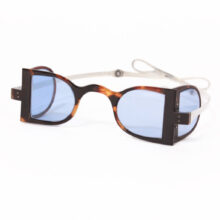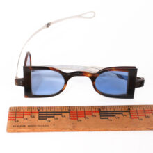 Railroad spectacles were designed for passengers riding in the often open carriages of early trains. Hinged D-shaped lenses unfold on either side, designed to protect one’s eyes from the cinders, smoke, and sparks billowing up from the belching coal-fired steam locomotive ahead. This particular pair is remarkable in that the frame is carved by hand from tortoiseshell, which was then riveted to the folding silver temples and hinged to adjust the shell-framed sidelights.