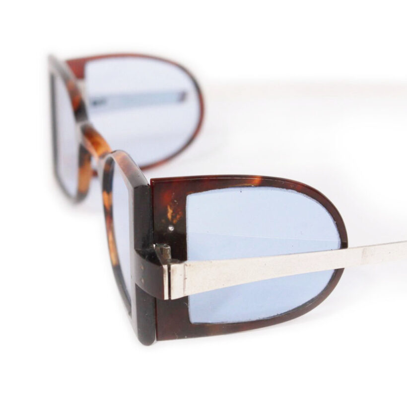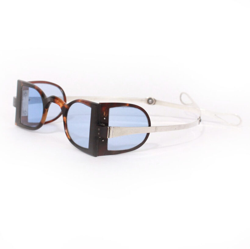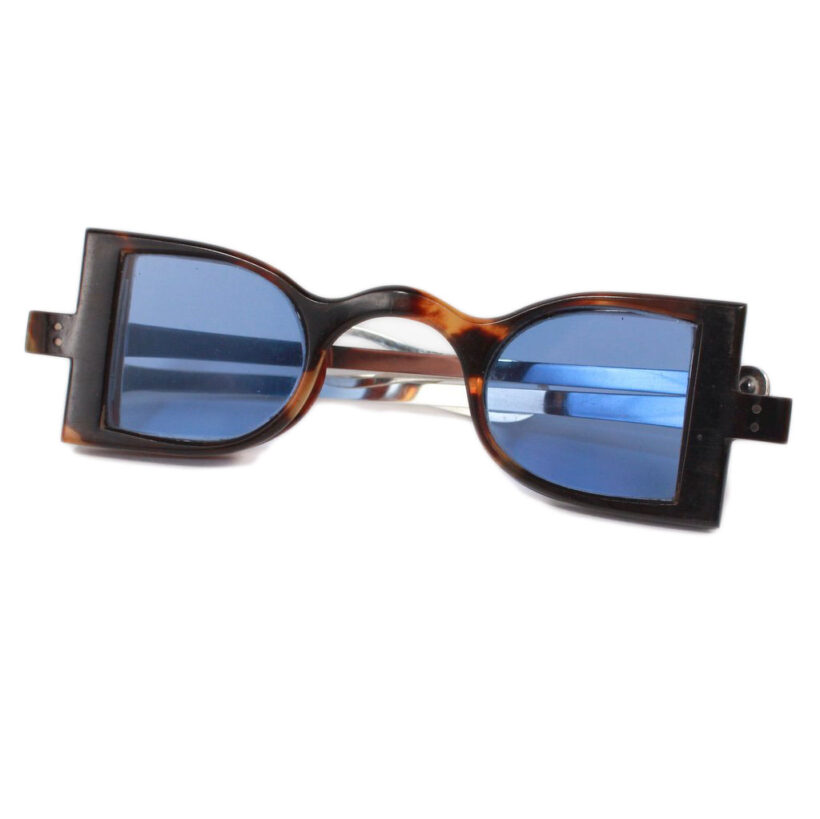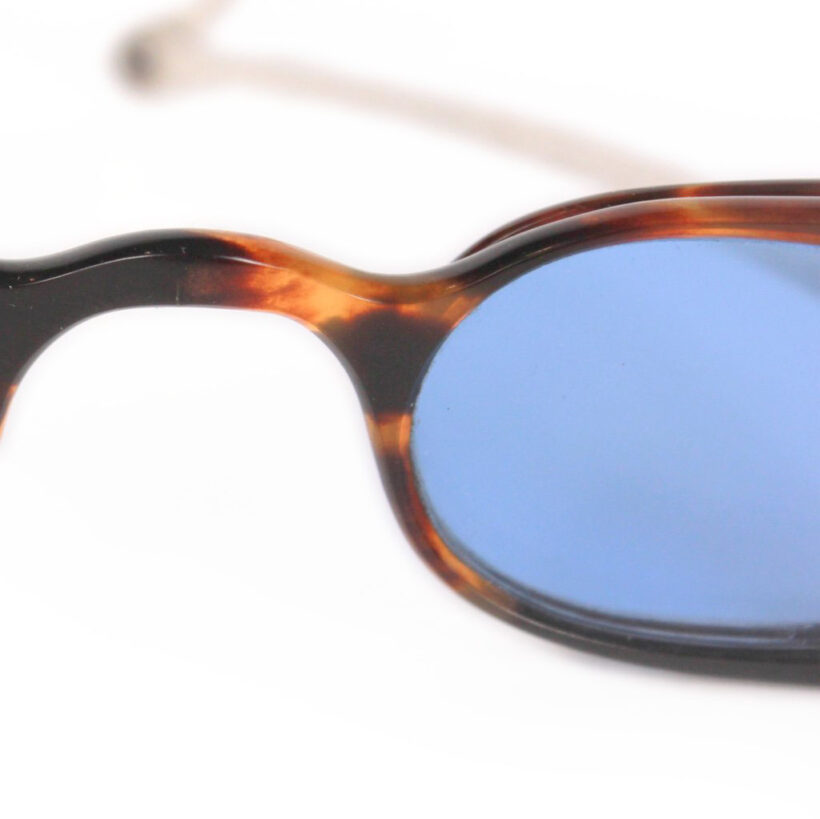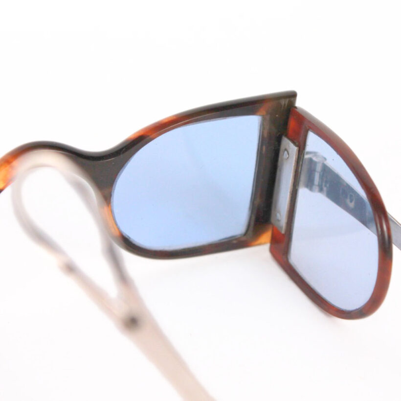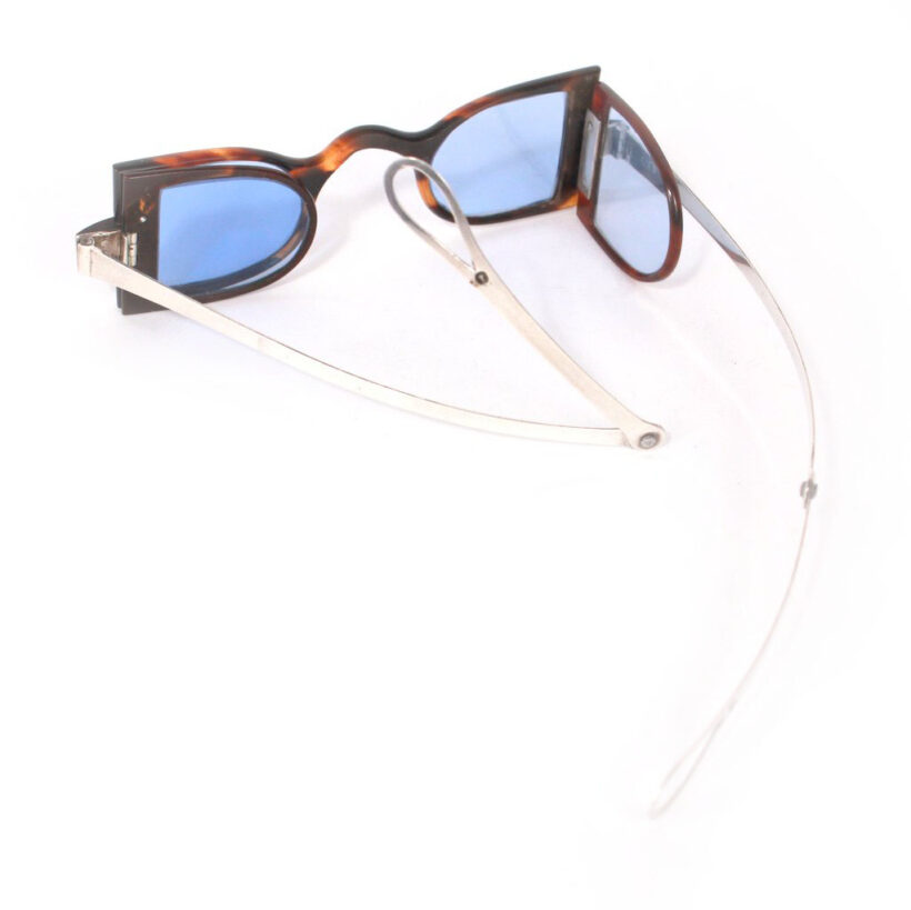 “Carriage” eyeglasses with folding side panels / tortoiseshell, sterling silver, tinted blue glass / c. 1830s