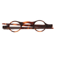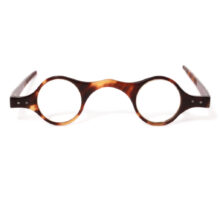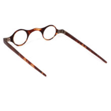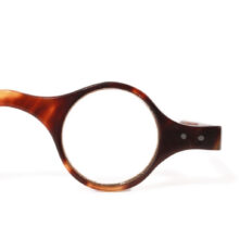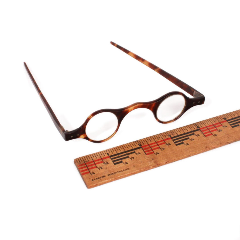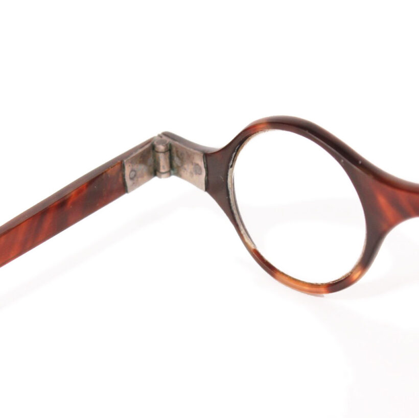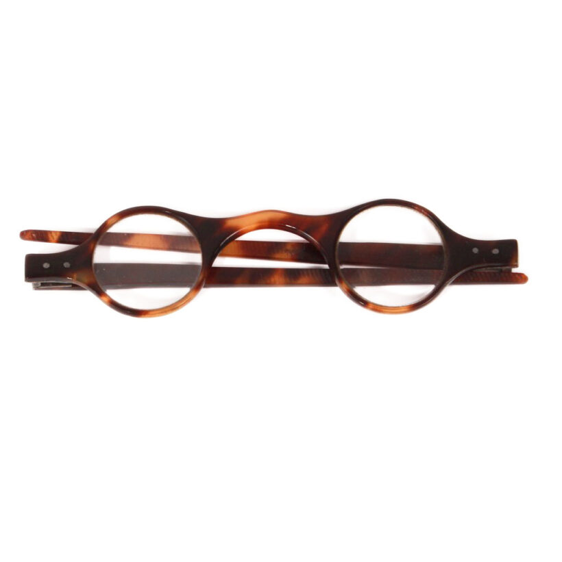 Rare antique tortoiseshell “wig” spectacles, c. late eighteenth or early nineteenth century. Hand-carved from tortoiseshell, these early reading glasses were designed with shorter temples to prevent them from getting caught in a gentleman’s powdered wig. The spectacles have silver fittings and hinges. Exquisite craftsmanship and timeless design.