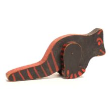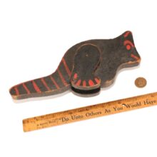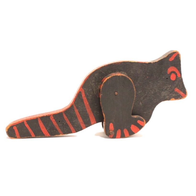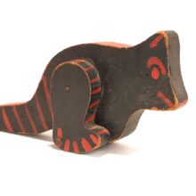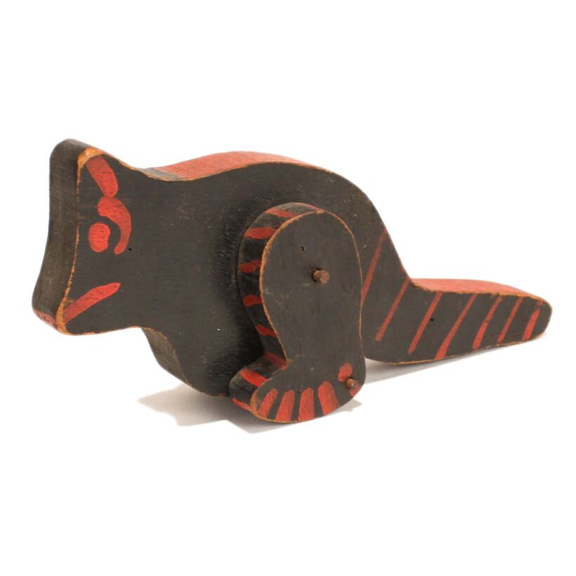 Toy folk art painted wooden dinosaur, c. 1930s. Black with red highlights. On his two short legs, he lumbers along with a very dinosaur-like gait, and seems to be a moody one given the two different expressions on each side of his face.