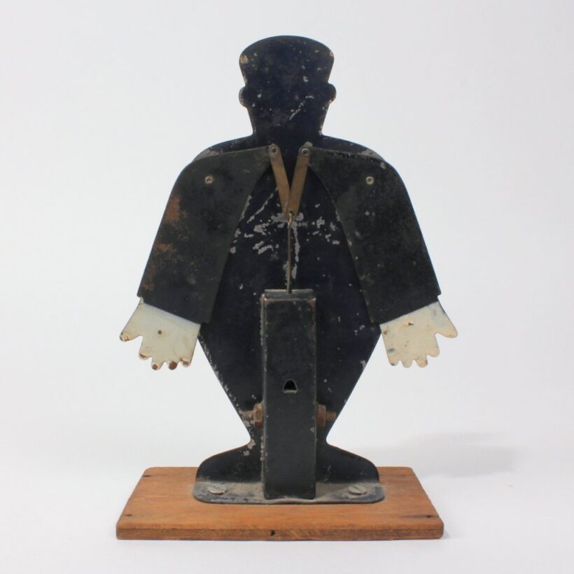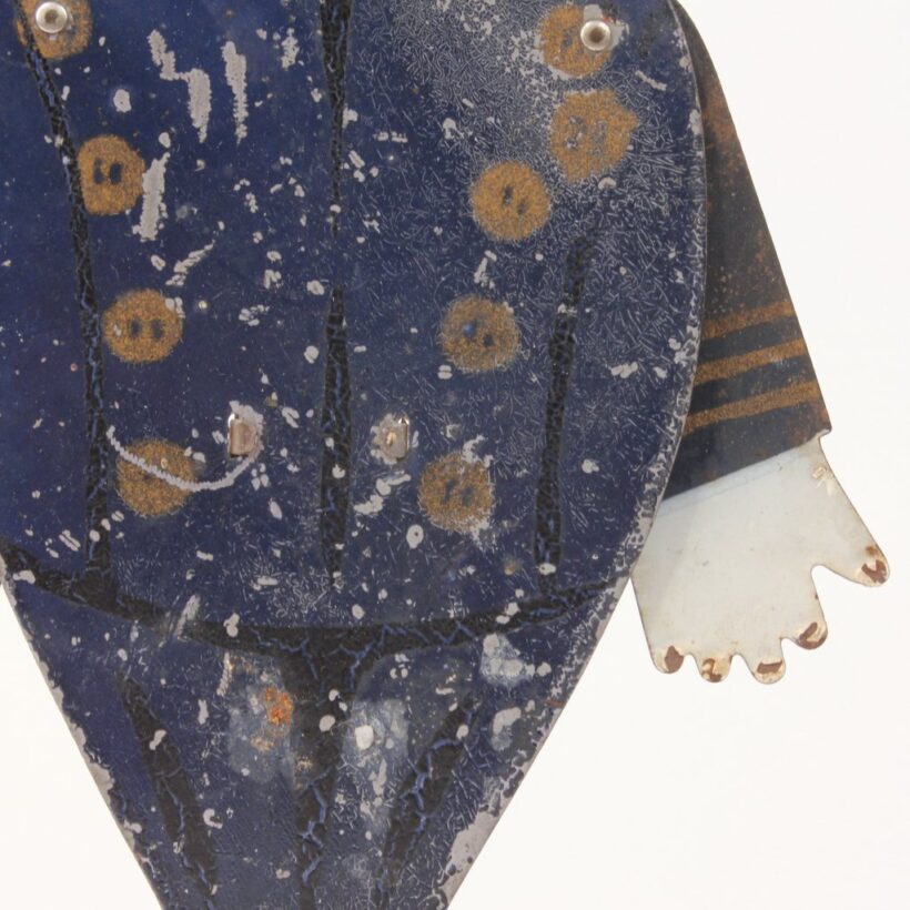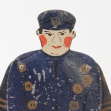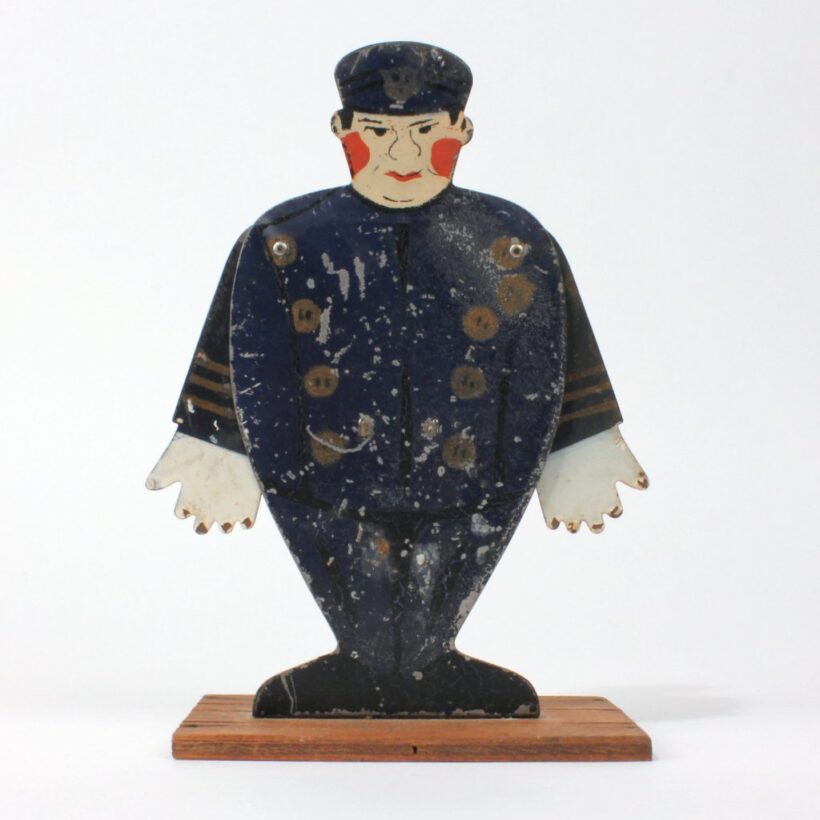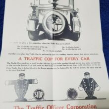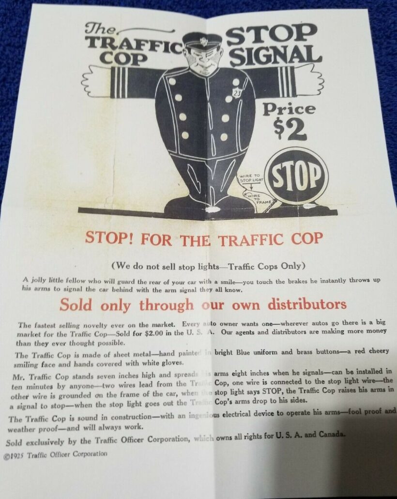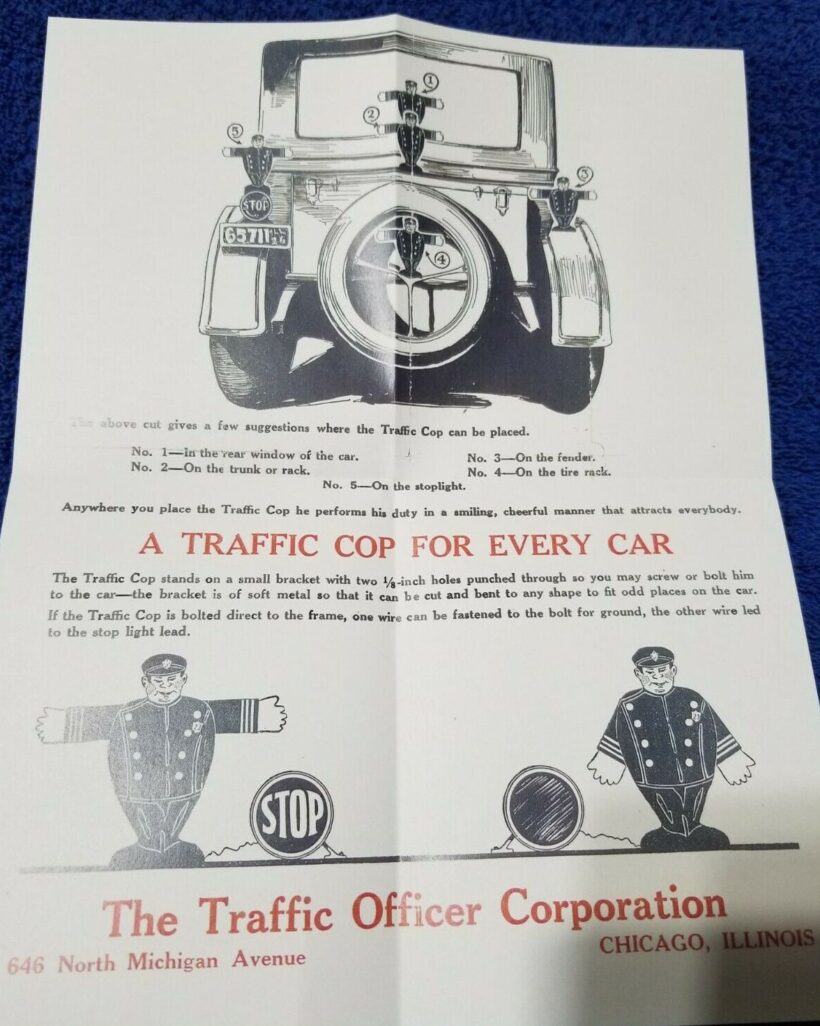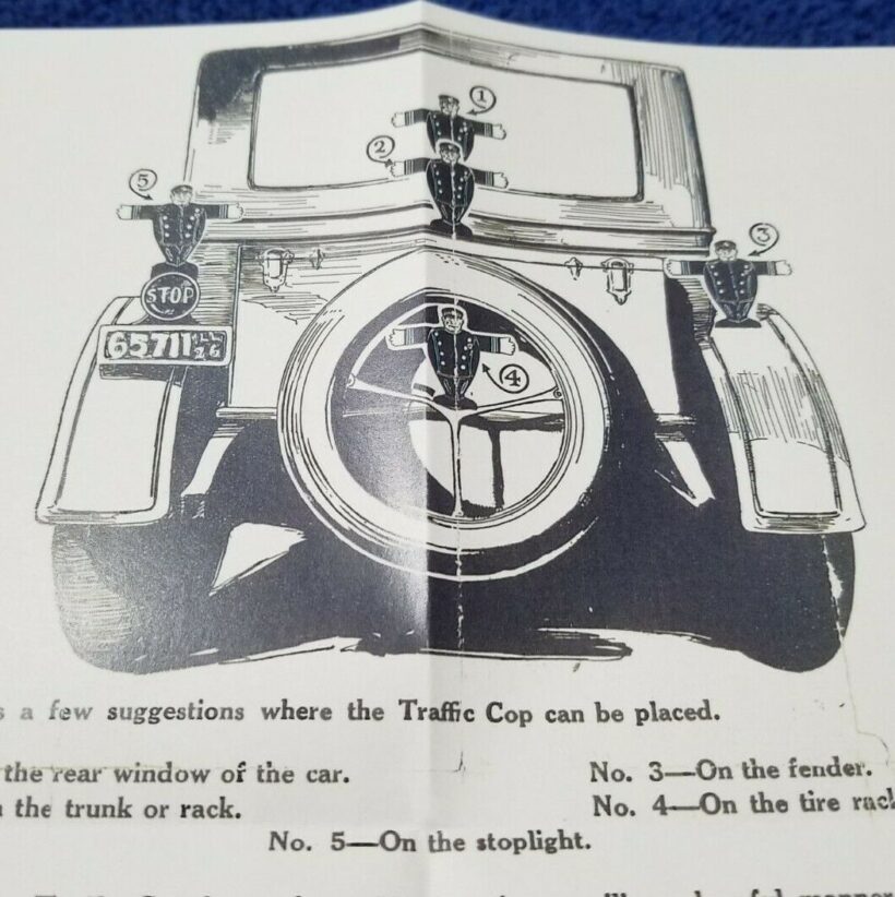 Rare automobile brake light automaton patented in 1925. Make sure that distracted driver behind your Model A is paying attention and mount this painted traffic cop on your bumper to lay down the law. Electrically-activated, the cop is designed to raised his white-gloved hands in the air as one hits the brake (a wire would connect the mechanism to the the brake light, engaging the arms). A rare piece of antique automobilia. (Note: I found the images of the instruction booklet online but it is not included here.)