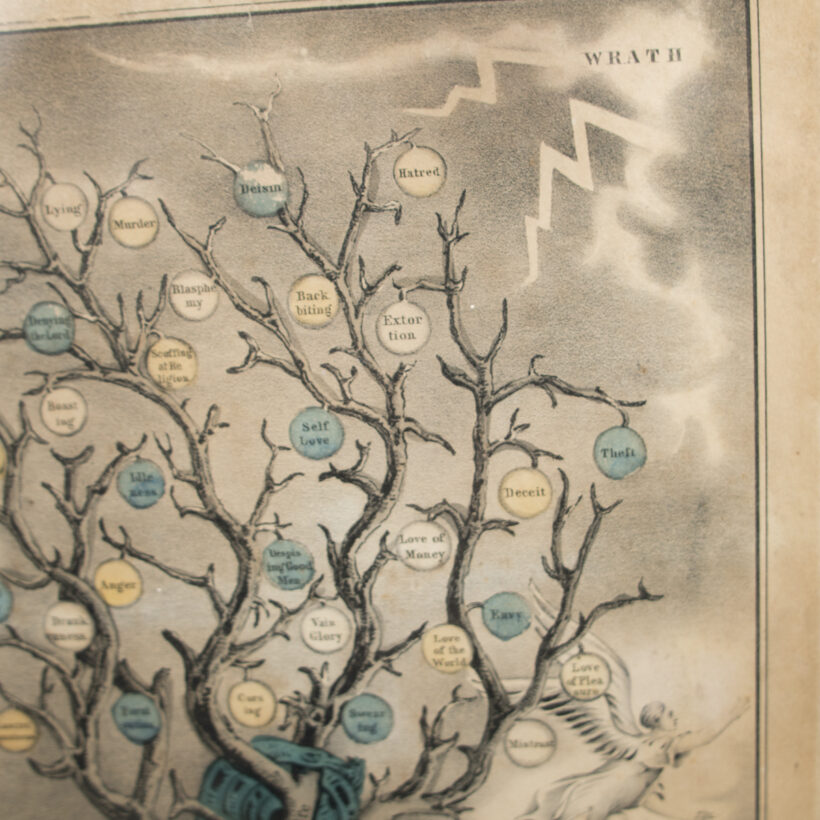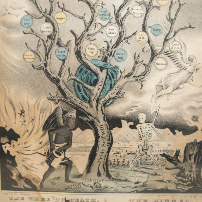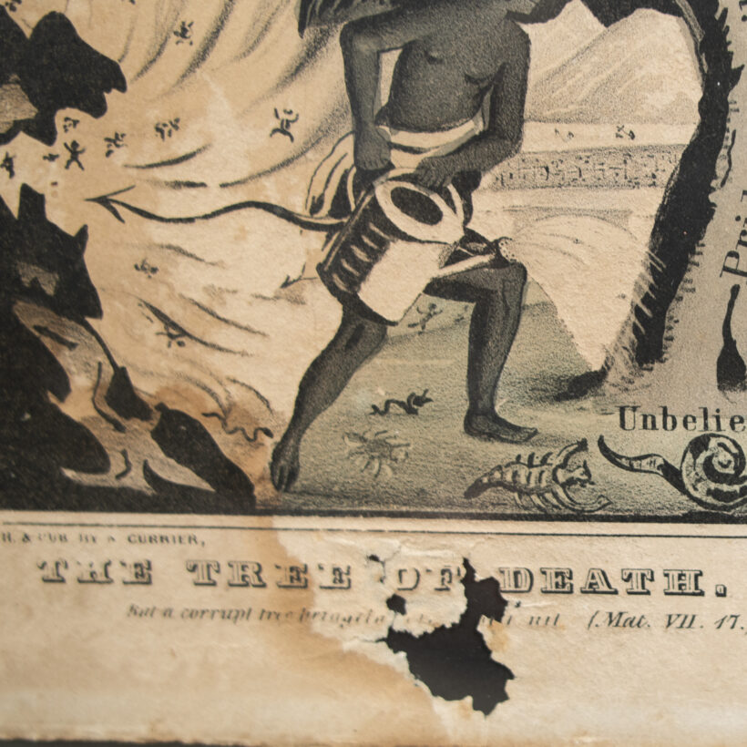 Rare early Currier print of the “Tree of Death” watered by the Devil and bearing the fruit of sin: Fornication, Anger, Vainglory, Love of Pleasure, Lasciviousness, and so on. The timeworn state befits its rotten subject.