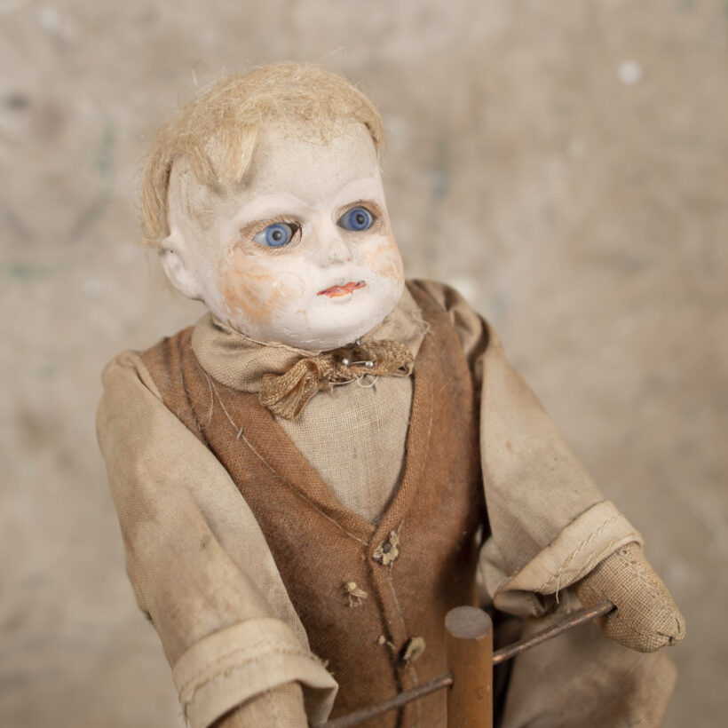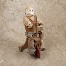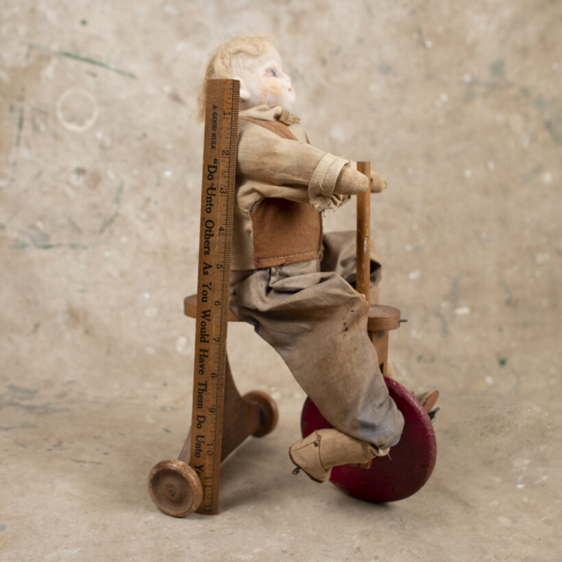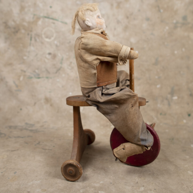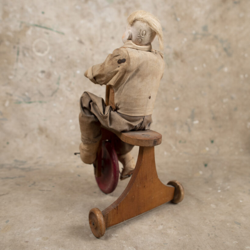 Toy doll riding tricycle / plaster, cloth, wood / c. late 19th century