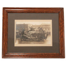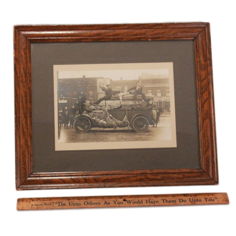 Framed photograph of hunters astride automobile with quarry / silver gelatin photograph / c. 1920s