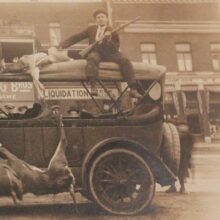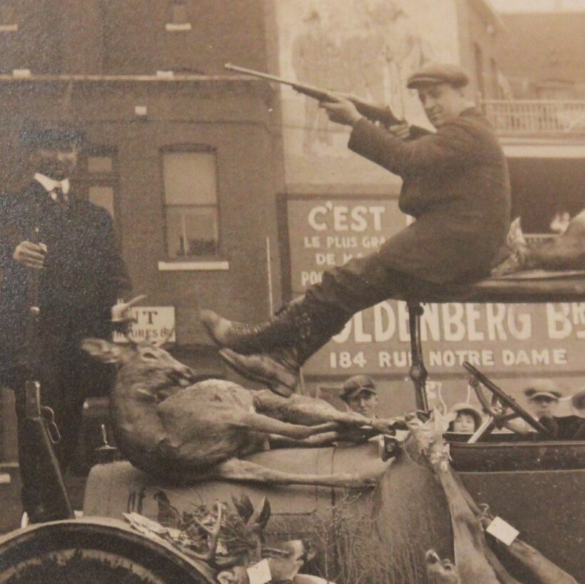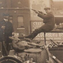 Original silver gelatin photograph of armed hunters returning from their war with wildlife, c. 1920s. Guns in the air, their sedan laden with the bodies of dead deer, the hunters make a triumphal homecoming. The urban, commercial setting (probably Montreal) stands in sharp contrast to the wilderness from which they have have returned. The gleeful expressions, the flaunted weapons, the closeness of death, the brutality and excess of their hunt — here situated in a workaday urban setting — all seem to warn of a dangerous threat beyond what is passable by Buick. The wilderness encroaches on this scene, and though the forest floor is littered with shotgun shells, it remains fearsome and unconquerable in the mind.