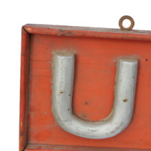 Used “USED” wooden sign from a secondhand furniture store, upstate New York, c. late 19th century. Each letter is hand-carved wood painted in silver radiator paint mounted on a solid board painted a salmon color. Iron eye hooks once attached the sign to other signs spelling out the furniture store name. A humble example of the vernacular signmakers’ art.