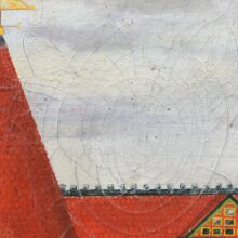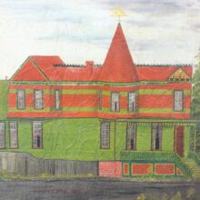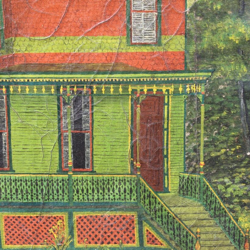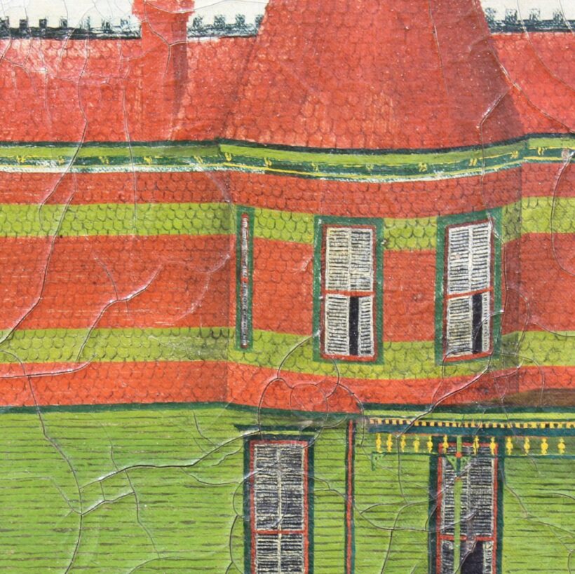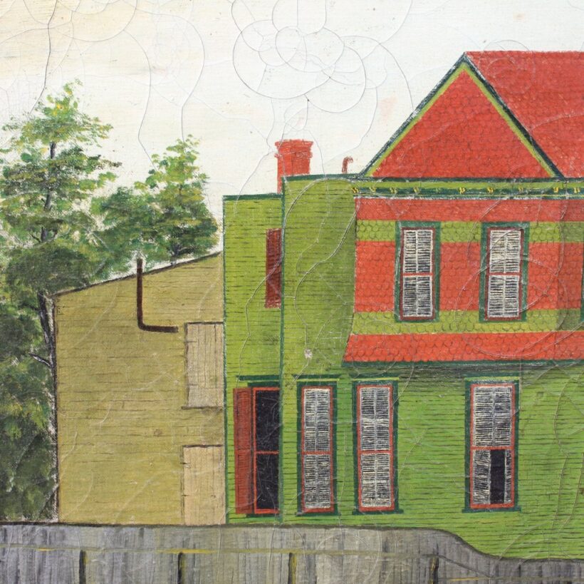 This is all to say the physical character of this exuberant late 19th century house is disregarded in this startlingly flat, two dimensional depiction, which verges on abstraction. While the artist dwells on the painstaking decorative details of the building, he also treats the rest of the scene evenhandedly, with stark workaday additions in the rear revealed as well as a dreary fence. Without a person in sight and with most of the window shutters closed on the house, the painting has a pensive, if not disquieting mood. Given the extreme attention to detail, it seems likely the painter lived in the house, which makes its ambivalent depiction all the more intriguing.